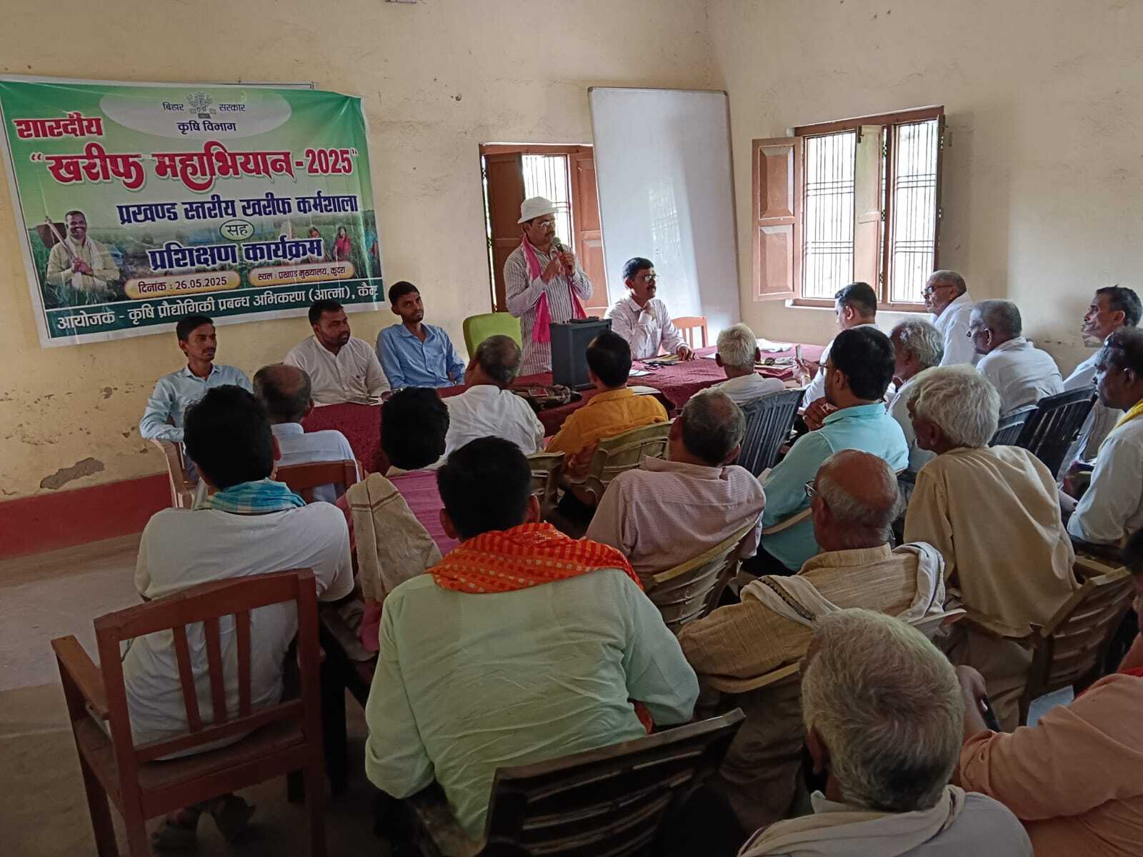 कुदरा. प्रखंड मुख्यालय के इ-किसान भवन के सभागार में सोमवार खरीफ महाअभियान सह महोत्सव कार्यक्रम का आयोजन किया गया. कार्यक्रम का उद्घाटन मुखिया संघ अध्यक्ष धर्मेंद्र कुमार सिंह ने किया. कार्यक्रम में कृषि विज्ञान केंद्र अधौरा के कृषि वैज्ञानिक अमित कुमार सिंह ने किसानों को खरीफ फसल उत्पादन अवशेष प्रबंधन धान की वैज्ञानिक खेती, धान के पौधे में लगने वाले रोग व रोग से बचने के उपाय, किट व्याधि प्रबंधन आदि के बारे में विस्तार से बताया गया. साथ ही फार्मर रजिस्ट्रेशन व इससे होने वाले लाभ के विषय में भी किसानों को विस्तार से बताया गया. उक्त अवसर पर तकनीकी सहायक अरुण कुमार, प्रखंड तकनीकी प्रबंधक राहुल कुमार, प्रखंड कृषि पदाधिकारी, सहायक तकनीकी प्रबंधक मनीष कुमार सिंह, रिंकी कुमारी, कृषि समन्वयक ब्रिज बिहारी सिंह, चंदन कुमार सिंह, विजय शंकर पांडे व किसान सलाहकार, लेखापाल अजय पांडे, कार्यपालक सहायक दीपक कुमार सिंह व किसान अभय सिंह, कन्हैया साह समेत दर्जनों किसान रहे.