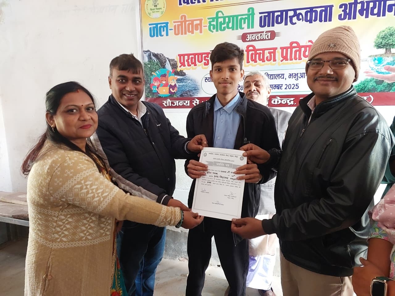 भभुआ प्रखंड स्तरीय आयोजित जल-जीवन हरियाली क्विज प्रतियोगिता में प्रखंड स्तर पर तीन विद्यार्थियों का चयन किया गया. जिसमें पीएमश्री प्लस टू उच्च विद्यालय भभुआ के छात्र श्याम पाठक ने प्रथम स्थान प्राप्त किया. उत्क्रमित उच्च विद्यालय सैंथा की छात्रा प्रियंका कुमारी को द्वितीय स्थान मिला, जबकि नेहरू स्मारक प्लस टू उच्च विद्यालय कम्हारी मनिहारी के छात्र दिवाकर कुमार ने तृतीय स्थान प्राप्त किया. चयनित तीनों छात्र-छात्राओं को प्रशस्ति पत्र देकर सम्मानित किया गया. इसके अतिरिक्त प्रतियोगिता में भाग लेने वाले सभी शेष प्रतिभागी छात्र-छात्राओं को सहभागिता प्रमाणपत्र प्रदान कर प्रोत्साहित किया गया, ताकि उनमें आगे भी ऐसे कार्यक्रमों में भाग लेने की प्रेरणा बनी रहे. प्रतियोगिता में चयनकर्ता और सहयोगी के रूप में प्रियंका कुमारी, राजेश कुमार सिंह, अनिल कुमार चौरसिया, सत्येंद्र सिंह, शाहिदा खातून और सावित्री कुमारी की महत्वपूर्ण भूमिका रही. वहीं कार्यक्रम का संचालन, देखरेख और पर्यवेक्षण जिला तकनीकी टीम के सदस्य शिवकुमार गुप्ता ने किया. गौरतलब है कि इस प्रतियोगिता का उद्देश्य छात्र-छात्राओं में जल संरक्षण, पर्यावरण संतुलन और हरियाली के महत्व के प्रति जागरूकता बढ़ाना था.