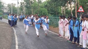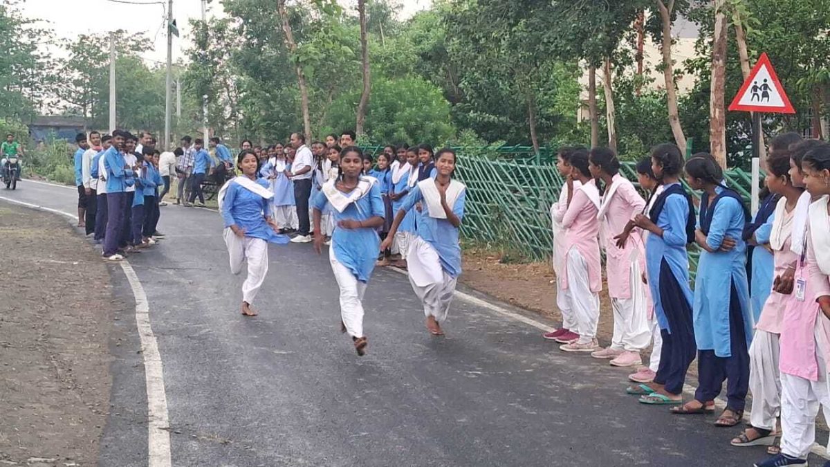 खेल मैदान के अभाव में पक्की सड़क पर छात्र-छात्राओं ने लगायी दौड़