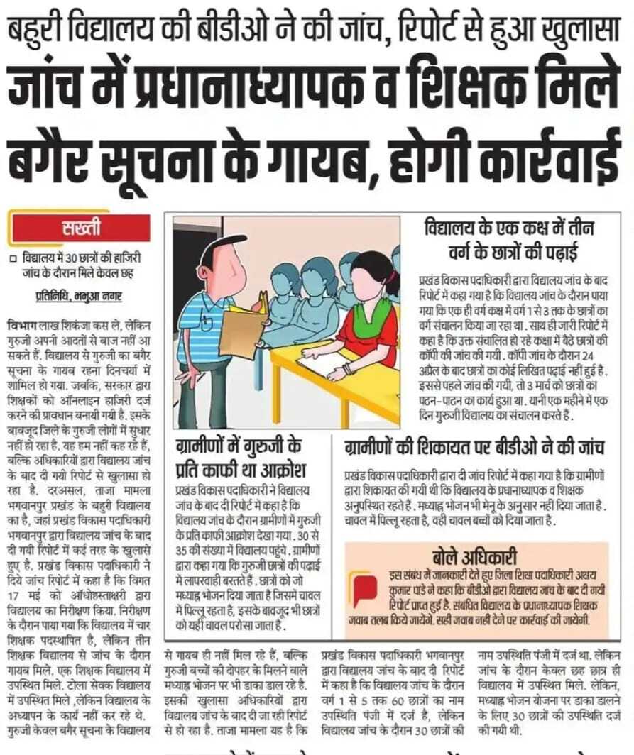 भभुआ नगर. प्रभात खबर का असर एक बार फिर देखने को मिला है. प्रभात खबर में खबर प्रकाशित होने के बाद तत्काल संज्ञान लेते हुए जिला शिक्षा पदाधिकारी अक्षय कुमार पांडे ने बहुरी विद्यालय में कार्यरत बीपीएससी शिक्षक अरविंद कुमार व विशिष्ट शिक्षक अलका राय को तत्काल प्रभाव से निलंबित कर दिया है. साथ ही दोनों गुरुजी लोगों पर प्रपत्र क गठित कर विभागीय कार्रवाई प्रारंभ करने का आदेश जारी किया गया है. इसके साथ ही दोनों शिक्षकों के लिये निलंबन अवधि के दौरान कार्यालय भी आवंटित कर दिया है. शिक्षिका अलका राय निलंबन अवधि के दौरान कुदरा प्रखंड शिक्षा पदाधिकारी कार्यालय में तैनात की गयी हैं, तो अरविंद कुमार को चांद प्रखंड शिक्षा पदाधिकारी का कार्यालय आवंटित किया गया है. दरअसल मामला यह है कि प्रखंड विकास पदाधिकारी भगवानपुर द्वारा बहुरी विद्यालय का निरीक्षण किया गया था. निरीक्षण के बाद प्रखंड विकास पदाधिकारी द्वारा जिला शिक्षा पदाधिकारी को निरीक्षण प्रतिवेदन पत्र के माध्यम से भेजते हुए कहा था कि विगत 17 मई को अधोहस्ताक्षरी द्वारा बहुरी विद्यालय का निरीक्षण किया गया. निरीक्षण के क्रम में पाया गया विद्यालय में चार शिक्षक कार्यरत हैं, लेकिन जांच के दौरान केवल एक शिक्षक विद्यालय में उपस्थित मिले. साथ ही बताया है कि विद्यालय में 60 छात्र नामांकित हैं, लेकिन जांच के दौरान उपस्थिति पंजी में 30 छात्रों की हाजिरी दर्ज की गयी थी, जबकि जांच के दौरान केवल छह छात्र ही विद्यालय में उपस्थित मिले. साथ-ही वर्ग 1 से 3 तक के छात्रों की पढ़ाई एक ही वर्ग कक्ष में संचालित हो रही थी. वहीं छात्रों के कॉपी का निरीक्षण करने से ज्ञात हुआ कि छात्रों के कॉपी पर शिक्षकों के द्वारा एक महीने से कोई भी पठन पाठन का कार्य नहीं कराया गया था. वहीं, प्रखंड विकास पदाधिकारी ने जांच रिपोर्ट में दी थी कि शिक्षकों के प्रति ग्रामीणों में काफी आक्रोश देखा गया. और ग्रामीणों द्वारा कहा गया कि शिक्षक बगैर सूचना के आये दिन विद्यालय से गायब रहते हैं और काफी अनियमितता है. इधर प्रखंड विकास पदाधिकारी द्वारा दी गयी जांच रिपोर्ट को प्रभात खबर ने बुधवार को अपने अंक में- ””जांच में प्रधानाध्यापक व शिक्षक बगैर सूचना के गायब होगी कार्रवाई”” शीर्षक से प्रमुखता से प्रकाशित किया था. इधर, प्रभात खबर में प्रमुखता से खबर प्रकाशित होने के बाद शिक्षा विभाग के अधिकारी हरकत में आये और तत्काल प्रभाव से दोनों शिक्षकों को निलंबित करते हुए प्रपत्र क गठित करने का आदेश जारी किया गया. गौरतलब है कि तीन-चार रोज पहले भी प्रभात खबर ने सरैया विद्यालय में शिक्षकों द्वारा छात्राओं के हाथों से भरोसा हुआ खाना खाने से संबंधित मामले को प्रमुखता से छापा था. इसके बाद जिला पदाधिकारी