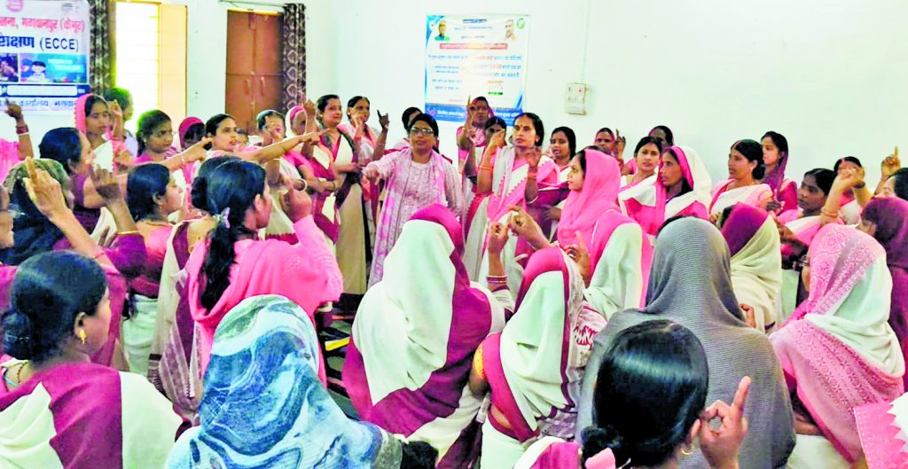 kaimur news. सेविकाओं को आंगनबाड़ी केंद्रों पर पहुंचने वाले बच्चों के साफ-सफाई, उठने-बैठने के अनुशासित तौर-तरीके, कविता, गीत एवं इशारे के माध्यम से पढ़ाने-लिखाने की जानकारी दी जा रही है.