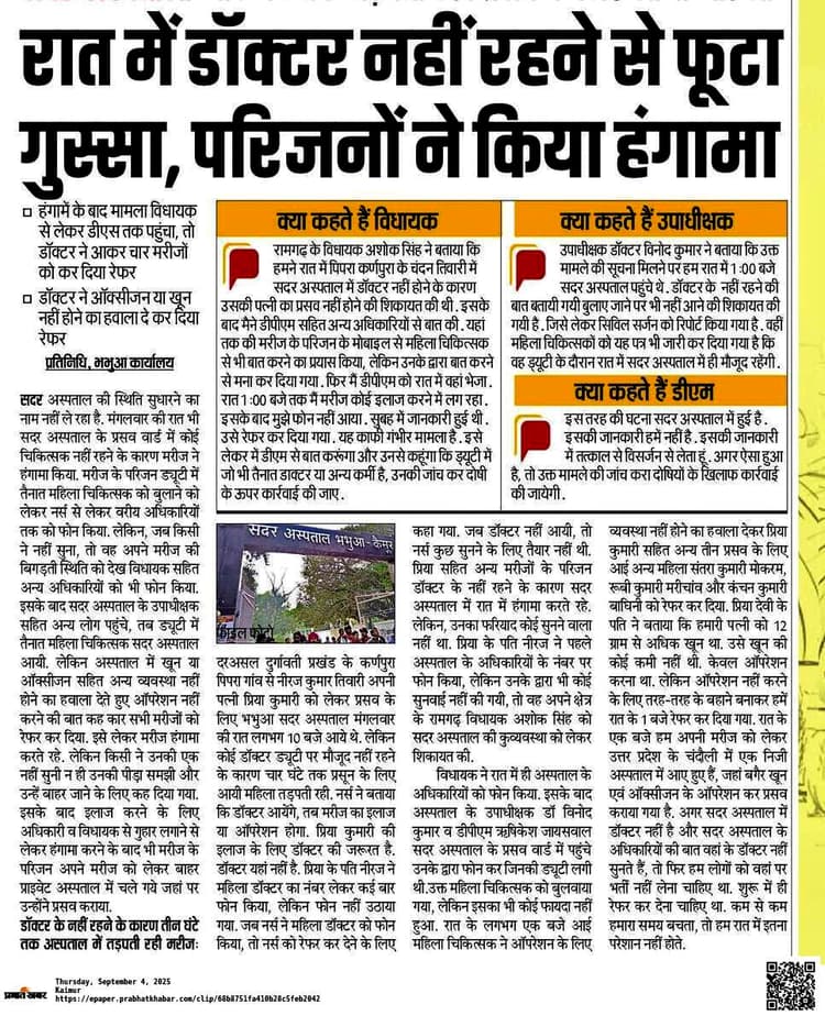 भभुआ कार्यालय. सदर अस्पताल के प्रसव वार्ड में मंगलवार की रात महिला चिकित्सक नहीं रहने पर प्रसव के लिए आयी महिला के परिजनों के द्वारा किये गये हंगामें के बाद अस्पताल प्रशासन ने यह निर्णय लिया है कि अब रात में भी महिला चिकित्सक ड्यूटी के दौरान अस्पताल में ही तैनात रहेंगी. इससे पहले अभी तक यह नियम था कि रात में महिला चिकित्सक ड्यूटी के दौरान ऑन कॉल अपने घर पर रहेंगी. ऑन कॉल का मतलब होता है कि जब कोई मरीज रात में आये और उसके इलाज के लिए चिकित्सक की जरूरत हो, तो जिस महिला चिकित्सक की ड्यूटी रहती थी उसे प्रसव वार्ड में तैनात नर्सों द्वारा फोन किया जाता था और उन्हें अस्पताल में आकर उक्त महिला मरीज का ऑपरेशन या इलाज करना होता था. लेकिन, मंगलवार की रात यह देखा गया कि दुर्गावती प्रखंड के कर्णपुरा पिपरा गांव से प्रसव के लिए चंदन तिवारी की पत्नी प्रिया कुमारी जब सदर अस्पताल पहुंची, तो वहां पर कोई भी चिकित्सक ड्यूटी में मौजूद नहीं था. लगभग दो से तीन घंटे तक चिकित्सक के नहीं रहने के कारण मरीज तड़पती रही. इसके बाद परिजनों द्वारा अस्पताल में हंगामा किया गया था. इसके बाद भी जब चिकित्सक नहीं आयी, तो अपने स्थानीय विधायक रामगढ़ के अशोक कुमार सिंह सहित स्वास्थ्य विभाग के वरीय अधिकारियों को मरीज के परिजनों द्वारा फोन किया गया. हंगामा की सूचना मिलने पर अस्पताल उपाधीक्षक डॉक्टर विनोद कुमार डीपीएम ऋषिकेश जायसवाल सहित अन्य लोग जब सदर अस्पताल पहुंचे, तब किसी तरह हंगामा कर रहे लोगों को शांत कराया और महिला चिकित्सक को सूचना दे उन्हें बुलवाया गया. जब महिला चिकित्सक आयी, तो उनके द्वारा उक्त मरीज सहित तीन अन्य तीन मरीजों को भी रेफर कर दिया गया. इधर, महिला चिकित्सक को बुलाने के लिए जब अस्पताल उपाधीक्षक ने फोन किया तो, अस्पताल उपाधीक्षक के मुताबिक महिला चिकित्सक ने यह कहा कि जब आप यहां रहेंगे, तभी मैं यहां रात में ड्यूटी करूंगी. इस तरह की स्थिति उत्पन्न होने एवं हंगामा होने के बाद अस्पताल उपाधीक्षक ने प्रभात खबर में उक्त मामला प्रमुखता से गुरुवार के अंक में ””रात में डॉक्टर नहीं रहने से फूटा गुस्सा, परिजनों ने किया हंगामा”” शीर्षक से खबर प्रकाशित होने के बाद यह आदेश निकाला है कि अब महिला चिकित्सक रात में भी ड्यूटी के दौरान अस्पताल में ही रहेंगी. साथ ही उनके रात में ठहरने के लिए अस्पताल प्रशासन के द्वारा कमरे की भी व्यवस्था कर दी गयी हैं, जहां वह रात्रि में ड्यूटी के दौरान ठहरेंगी. बहस करने पर अस्पताल उपाधीक्षक में सिविल सर्जन को करवाई के लिए भेजी रिपोर्ट अस्पताल के कर्मियों के बुलाई जाने पर ड्यूटी के दौरान रात में अस्पताल नहीं आने और इसे लेकर पूछे जाने पर उपाधीक्षक से बहस करने को लेकर महिला चिकित्सक डॉक्टर मन