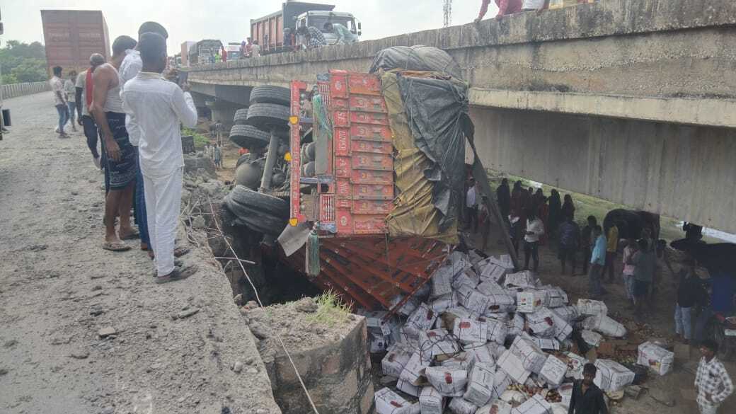 डहला मोड़ पर पुल से 10 फुट नीचे गिरा ट्रक, पुलिस ने किया रेस्क्यू एक माह पहले भी हुई थी इसी जगह हादसा, चालक बाल-बाल बचा था कर्मनाशा. दुर्गावती थाना क्षेत्र के डहला गांव के समीप शुक्रवार की सुबह एक फल लदा ट्रक अनियंत्रित होकर पुल की रेलिंग तोड़ते हुए 10 फुट नीचे पलट गया. घटना में चालक गंभीर रूप से घायल हो गया. घटना स्थल पर ग्रामीणों की भीड़ इकट्ठा हो गयी. सूचना पर पुलिस व एनएचएआइ की टीम मौके पर पहुंची. पुलिस और ग्रामीणों के सहयोग से ट्रक के केबिन में फंसे चालक को काफी मशक्कत के बाद बाहर निकाला गया. घायल चालक गुरप्रीत सिंह, पंजाब के उल्लरहेड़ी गांव का निवासी बताया जाता है. जानकारी के अनुसार, ट्रक हिमाचल प्रदेश से फल लोड कर एनएच के रास्ते बंगाल जा रहा था. जैसे ही ट्रक शुक्रवार की सुबह करीब नौ बजे कैमूर जिले के दुर्गावती थाना क्षेत्र डहला मोड़ के पास पहुंचा, तभी यह अनियंत्रित होकर पुल की रेलिंग तोड़ते हुए 10 फुट नीचे गिर गया और पलट गया. घटना में ट्रक भी क्षतिग्रस्त हो गया और ट्रक में लदे सेब की पेटियां जमीन पर बिखर गयीं. मौके पर बड़ी संख्या में ग्रामीण इकट्ठा हो गये. उनकी सूचना पर स्थानीय पुलिस व एनएचएआइ की टीम भी तुरंत पहुंची. पुलिस और ग्रामीणों ने मिलकर काफी मशक्कत के बाद केबिन में फंसे चालक को बाहर निकाला और आनन-फानन में प्राथमिक स्वास्थ्य केंद्र दुर्गावती भेजा गया. बता दें कि एक माह पहले भी डहला गांव के पास इसी जगह पर एक ट्रक अनियंत्रित होकर पुल से नीचे पलटा था. उस समय चालक बाल-बाल बच गया था.