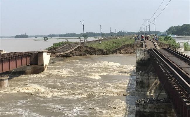 कटिहार (प्रतिनिधि) : बिहार में बाढ़ की विभिषका ने कटिहार रेल मंडल को चपेट में ले लिया है. कटिहार-एनजेपी रेल खंड के तेलता ब्रिज संख्या 133 महानंदा के बाढ़ से बह गया. नीचे का सतह पूरी तरह से कट कर बह गया. इससे ट्रेनों का परिचालन पूरी तरह से बाधित हो गया है. इसके कारण पूर्व मध्य से पूर्वोतर के एनजेपी व असम जाने वाली सभी ट्रेनें रद्द कर दी गयी हैं. रेल प्रशासन ने कटिहार मंडल से होकर गुजरने वाली सभी ट्रेनों को शॉर्ट टर्मिनेट, राजधानी सहित कई महत्वपूर्ण ट्रेन को कटिहार रेलवे स्टेशन से चलाया. पूर्व मध्य रेलवे का पूर्वोत्तर राज्य से संपर्क पूरी तरह से टूट गया है.