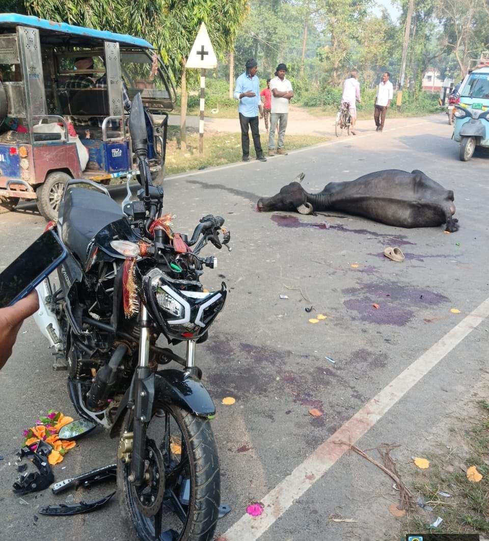 कोढ़ा कोढ़ा थाना क्षेत्र के जीडी रोड स्थित नजरा चौकी स्कूल के पास नहर पुल के पास गुरुवार की देर रात करीब दो बजे सड़क हादसा हो गया. इस हादसे में सड़क पार कर रही एक भैंस की मौके पर ही मौत हो गयी. जबकि भैंस से टकराने वाला बाइक चालक गंभीर रूप से घायल हो गया. घटना के बाद आसपास के लोगों में अफरा-तफरी मच गयी. युवक भवानीपुर मेला देखने गया था. देर रात अपनी बाइक से घर लौट रहा था. इसी दौरान अचानक सड़क पार कर रही भैंस बाइक के सामने आ गयी. तेज रफ्तार में आ रही बाइक भैंस से जा टकराई. जिससे जोरदार आवाज हुई. टक्कर इतनी जबरदस्त थी कि भैंस की घटनास्थल पर ही मौत हो गयी. बाइक चालक गंभीर रूप से घायल होकर सड़क पर गिर पड़ा. स्थानीय लोगों की मदद से घायल युवक को तुरंत अस्पताल पहुंचाया गया. जहां उसका इलाज जारी है. कोढ़ा थाना पुलिस मौके पर पहुंची और दुर्घटनाग्रस्त बाइक को जब्त कर थाना लायी. घायल युवक की पहचान मखदमपुर पंचायत निवासी झबरू महलदार के 22 वर्षीय पुत्र वकील कुमार के रूप में की गयी है. जो मखाना फोड़ी के व्यवसाय से जुड़े हैं.