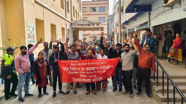 कटिहार बिहार चिकित्सा व जन स्वास्थ्य कर्मचारी संघ के बैनर तले स्वास्थ्य कर्मचारियों ने प्रदेश संघ के निर्णयनुसार शनिवार को अपनी 22 सूत्री मांगों को लेकर सिविल सर्जन कार्यालय के समक्ष प्रदर्शन किया. प्रदर्शन का नेतृत्व जिलाध्यक्ष रीना कुमारी, जिला मंत्री सह राज्य सहायक महामंत्री सुभाष चंद्र महतो ने किया. कर्मचारियों ने अपनी विभिन्न लंबित समस्याओं को लेकर एक विस्तृत मांग-पत्र सिविल सर्जन को सौंपा. जिला मंत्री सुभाष चंद्र महतो ने कहा कि हमारी मांगे हैं कि श्रम कोड को बिहार में लागू नहीं किया जाय. एनपीएस, यूपीएस समाप्त कर सभी कर्मचारियों को एक सितंबर 2005 से पूर्ण पेंशन का लाभ दिया जाय. परिचारिका श्रेणी ए एएनएम सहित अन्य राज्य संवर्ग का एमएसीपी निदेशालय के बजाय सिविल सर्जन अधीक्षक प्राचार्य निदेशक को एमएसीपी करने के लिए आदेशित किया जाय. सामान्य प्रशासन विभाग बिहार पटना के आदेश संख्या 19300, 13 अक्तूबर 2023 किया. लोक में सभी स्वास्थ्य कर्मचारियों को पद पदोन्नति का लाभ दिया जाय. स्वास्थ्य समिति के कर्मचारियों का संवर्ग नियमावली का अभिलंब गठन करते हुए उनकी सेवा समायोजित किया जाय. स्वास्थ्य विभाग के अंतर्गत कार्यरत संविदागत कर्मियों की सेवा नियमित करने के लिए प्रतियोगिता परीक्षा के बजाय सक्षमता परीक्षा लिया जाय तथा अनुभव के अंक जोड़ने के लिए अहर्तक प्राप्त करने संबंधी आदेश को रद्द किया जाय. कुछ नहीं आया ले बिहार पटना के फैसले के आलोक में एसीपी एमएसीपी के लिए लिपि को विभाग परीक्षा के बाध्यता पर रोक संबंधी विभाग आदेश निर्गत किया जाय. एएनएम जीएनएम का सेवा संपुष्टि के लिए पत्र अभिलंब निर्गत किया जाय या सभी प्राचार्य अधीक्षक निदेशक सिविल सर्जन को सेवा संतुष्ट करने के लिए पत्र निर्गत कर आदेशित किया जाय. आउटसोर्सिंग पर कार्यरत कर्मचारियों का न्यूनतम वैधानिक मजदूरी 26000 रूपया भुगतान किया जाय. ईएसआई, ईपीएफ का लाभ दिया जाय आदि मांगे शामिल है. जिला सहायक मंत्री मंतोष कुमार, उपाध्यक्ष निशात परवीन, प्रसून कुमार, मनोज कुमार चौधरी, मनोज कुमार पासवान रामेश्वर उरांव, शैलेंद्र पांडे, संयुक्त मंत्री राजेश सिंहा, बंकेश मीना, महिपाल, अंजली कुमारी, पिंकी कुमारी सोनी आदि उपस्थित थे.