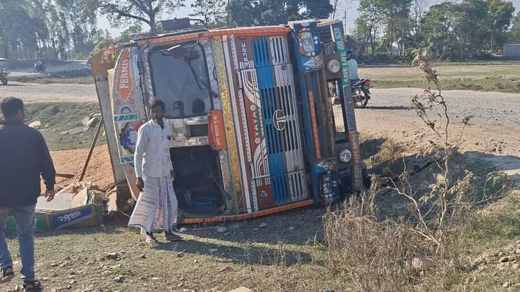 कदवा थाना क्षेत्र के सोनैली- पूर्णियां पथ के कोचखालीबारी पुल जो निर्माणाधीन है. डायवर्सन पर एक बालू से लदा ट्रक पलट गया. जहां बड़ा हादसा होते- होते टला. पूर्णिया- सोनैली मुख्य सड़क के कोचखालीबारी स्थित पुल निर्माण कार्य के शिलान्यास हुए लगभग तीन वर्ष बीत चुके है, लेकिन निर्माण कार्य अबतक अधर में लटका हुआ है. निर्माण एजेंसी के लापरवाही के कारण आवागमन डायवर्सन के सहारे हो रहा है. जहां आये दिन दुर्घटनाएं हो रही है. गुरुवार की रात सोनैली- पूर्णिया पथ अंतर्गत कोचखालीबारी डायवर्सन पर बालू से लदा सोलह चक्का ट्रक अनियंत्रित होकर पलट गयी. इस हादसे में चालक एवं उप चालक सुरक्षित बच गये. दोनों को सिर्फ हल्की चोटें आई है. चालक खुर्शीद ने बताया कि ट्रक में बालू जमुई में लोड किया गया था. जो सोनैली- पूर्णिया पथ से पश्चिम बंगाल के मालदा जिले के रतुआ गांव जा रहा था. रास्ते में अचानक कोहरा छाने की वजह से सड़क साफ दिखाई नहीं दिया और ट्रक पलट गयी. रात के अंधेरे में किसी तरह ट्रक का शीशा तोड़कर हमदोनों बाहर निकल पाये. घटना में कोई बड़े नुकसान की जानकारी नहीं मिली है. कदवा पुलिस ने बताया कि ठंड एवं कोहरे के कारण विजिबिलिटी कम होने से चालक सड़क को ठीक से नहीं देख पाया और ट्रक पलट गया. पुलिस मामले की जांच कर रही है.