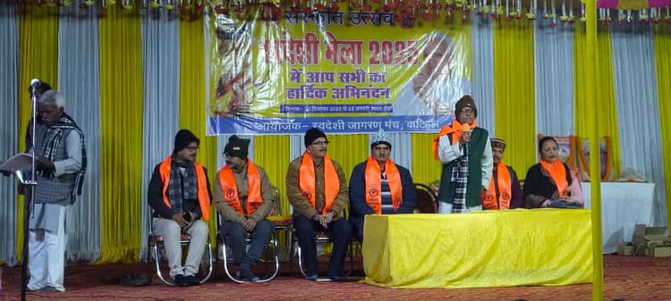 कटिहार संस्कृति उत्सव स्वदेशी मेला के समापन समारोह की अध्यक्षता प्रो श्याम नारायण पोद्दार ने किया. जबकि मुख्य अतिथि डॉ शैलेन्द्र नारायण ठाकुर, विशिष्ट अतिथि मनु शेखर, प्रांत संयोजक रामशंकर हिन्दवानी, अतिथि प्रांत सह संयोजक हर्शुल कुमार, यशवर्धन सिंह एवं शोभा जयसवाल को मंचासीन थे. मंच का संचालन प्रांत सह संयोजक विनय भूषण ने किया. कार्यक्रम का शुभारंभ आम्रपाली यादव के स्वदेशी गीत से हुआ. मंच से संबोधित करते हुए स्वदेशी जागरण मंच के प्रांत संयोजक रामशंकर हिन्दवानी ने कहा कि राष्ट्र की अर्थव्यवस्था में स्थानीय योगदान को बढ़ावा देने के लिए स्वदेशी जागरण मंच ने स्वदेशी मेला का आयोजन किया गया है. कटिहार के स्वदेशी मेला में वस्तु विनिमय से ज्यादा जागरण कार्यक्रम नियमित 13 दिन चलता रहा. इसके बाद रंजना झा का स्वभाषा गीत कै उपरांत मनु शेखर ने स्वदेशी आंदोलन पर प्रकाश डालते हुए 1905 के बंग-भंग आंदोलन एवं 1991 में स्वदेशी जागरण मंच की जरूरत और स्थापना पर प्रकाश डाला. समापन समारोह में कवि सम्मेलन में भाग लेने वाले डॉ जवाहर देव, आम्रपाली यादव, लक्ष्मी कुमारी, नेहा किरण, अवध बिहारी आचार्य, शिवकुमार नीलकंठ, शाकिब कलीम एवं डॉ अजय कुमार मीत को स्वदेशी सम्मान से सम्मानित किया गया. बाल परिधान उत्सव में सात वर्ष तक के बच्चे को उनके प्रदर्शन के लिए श्री कुमारी, अरमान कुमार, अक्षत महेश्वरी, हनी श्रीवास्तव, अवनी कुमार, शौर्य श्रीवास्तव, आकांक्षा गुप्ता, रुद्राक्ष, श्रेयांसि, सुनिधि सहित 35 बच्चों एवं बीरबाल दिवस पर प्रदर्शन में शामिल जियांशी कुमारी, श्री प्रिया, भव्या झा, सुमीत कुमार, अनुज्ञा यदुवंशी सहित 18 बालक को स्वदेशी सम्मान से सम्मानित किया गया. कार्यक्रम को सफल बनाने में विभाग संयोजक अवधेश कुमार देव, जिला संयोजक महेश कुमार, नगर संयोजक जयप्रकाश बारीक, प्रोफेसर प्रभु नारायण लाल दास, योगेश पूर्वे, श्याम सुंदर पांडे, सत्यनारायण प्रसाद, इन्द्रजीत सिंह, दसरथ प्रसाद राय, महेन्द्र पासवान, विद्यानंद शर्मा, अरुण कुमार चौधरी, शंकर साह, डॉ ब्रजेश कुमार झा, नेहा कुमारी, पूजा शर्मा, रंजना झा, बबीता मिश्रा, डॉ किरण मिश्रा, प्रभा दास, रीता राउत, प्रियंका सिंह, मंजू चन्द्रवंशी आदि दर्जनों कार्यकर्ताओं ने सहयोग किया.