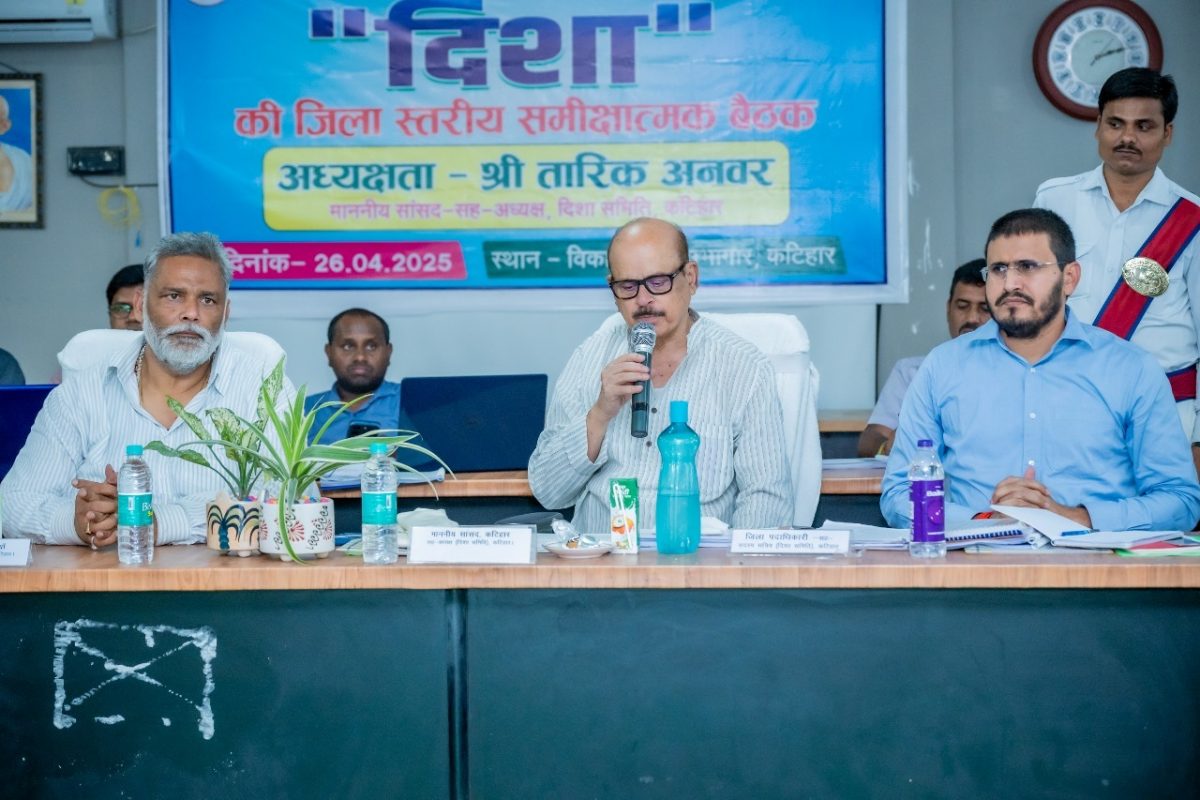 – सांसद की अध्यक्षता में हुई दिशा की बैठक में 67 योजनाओं की समीक्षा कटिहार विकास भवन सभागार में सांसद तारिक अनवर की अध्यक्षता में शनिवार को जिला विकास समन्वय एवं निगरानी समिति (दिशा) की बैठक आयोजित की गयी. जिसमें केन्द्र सरकार द्वारा संचालित 67 विभागों से संबंधित योजनाओं व कार्यक्रम की समीक्षा की गयी. सांसद सह अध्यक्ष तारिक अनवर ने सभी पदाधिकारियों को संबोधित करते हुए कहा कि इस बैठक के माध्यम से केन्द्र की जो भी योजनाएं संचालित है. वैसी योजनाओ की समीक्षा कर कल्याणकारी एवं विकासात्मक कार्यो में तेजी लाना तथा सरकार द्वारा आमजनों के लिए संचालित जनकल्याणकारी योजना का लाभ अधिक से अधिक लोगों को उपलब्ध कराना है. इसके आलोक में पूर्व की बैठक में विभिन्न विभागों द्वारा संचालित योजनाओं के संबंध में जो निर्देश दिये गये थे. उसके बारे में भी प्राप्त शिकायतें एवं सुझाव पर विस्तृत चर्चा किया गया. सांसद पूर्णिया सह उपाध्यक्ष दिशा राकेश रंजन उर्फ पप्पू यादव ने भी अपनी शिकायत एवं सुझाव पर विस्तृत रूप से चर्चा करते हुए आवश्यक दिशा निर्देश दिया. सभी विधायकों, प्रखंड प्रमुखों, नगर निकायों के अध्यक्षों एवं जनप्रतिनिधियों द्वारा सुझाव, प्रस्ताव तथा शिकायतों को दर्ज कराया गया. इस पर संबंधित पदाधिकारियों से जानकारी प्राप्त करते हुए उचित कार्रवाई का निर्देश दिया गया. जिलाधिकारी द्वारा आश्वस्त किया गया कि जितने बिंदुओं को उठाया गया है. सब को स-समय पूर्ण करने का प्रयास किया जायेगा. बैठक में अध्यक्ष सह सांसद तारिक अनवर केे साथ सांसद पूर्णिया सह उपाध्यक्ष राजेश रंजन उर्फ पप्पू यादव, विधायक कदवा डॉ. शकील अहमद खान, विधायक बरारी विजय सिंह, विधायक प्राणपुर निशा सिंह, विधायक कोढ़ा कविता देवी, विधायक मनिहारी मनोहर प्रसाद सिंह, जिला परिषद अध्यक्ष रश्मि सिंह के साथ-साथ विभिन्न नगर पंचायतों के मुख्य पार्षद एवं जिला पदाधिकारी सह सदस्य सचिव मनेश कुमार मीणा, उप विकास आयुक्त अमित कुमार, नगर आयुक्त संतोष कुमार, अपर समाहर्ता सुमन प्रसाद साह, निदेशक डीआरडीए सुदामा प्रसाद सिंह, जिला पंचायत राज पदाधिकारी, जिला योजना पदाधिकारी, सहायक निदेशक सामाजिक सुरक्षा, अल्पसंख्यक कल्याण पदाधिकारी, जिला जनसंपर्क पदाधिकारी एवं अन्य सभी संबंधित जिला स्तरीय पदाधिकारीगण उपस्थित थे. 5.20 लोगों मिला मनरेगा में रोजगार: डीएम बैठक में विभिन्न विभागों को दिये गये निर्देश के अनुपालन की संपुष्टि की गयी तथा बैठक की कार्यवाही को आगे बढ़ाते हुए सांसद को विभिन्न विभाग अंतर्गत केन्द्र सरकार द्वारा संचालित योजनाएं तथा परियोजना में विभाग से प्राप्त लक्ष्य के विरूद्व अबतक किये गये कार्यों की उपलब्धि के संबंध में जिला पदाधिकारी मनेश क