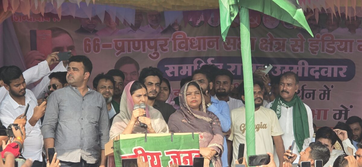 आजमनगर आजमनगर प्रखंड क्षेत्र के गायघट्टा मैदान में उत्तर प्रदेश के सांसद इकरा हसन ने चुनावी सभा को संबोधित किया. सभा को संबोधित करते हुए उन्होंने कहा कि बेजेपी सिर्फ नफरत की राजनीतिक करती है. एनडीए की सरकार में एक दूसरे समाज को बांटने की काम किया जा रहा है. एक दूसरे धर्मों के बीच नफरत फैलाने का काम किया जा रहा है. कहा कि यह चुनाव सरकार बदलने का चुनाव है. निचले स्तर के लोग काफी परेशान है. लोगों को रोजगार नहीं मिल रहा है. युवा दिन प्रतिदिन बेरोजगार होते जा रहे है. युवाओं को रोजगार की तलाश में युवा अन्य प्रदेश में पलायन को मजबूर हो रहे है. उन्होंने कहा कि महागठबंधन की सरकार बनने पर हर घर नौकरी मिलेगी. तेजस्वी ने राजद प्रत्याशी इशरत प्रवीण को वोट करने की लोगों से अपील की.