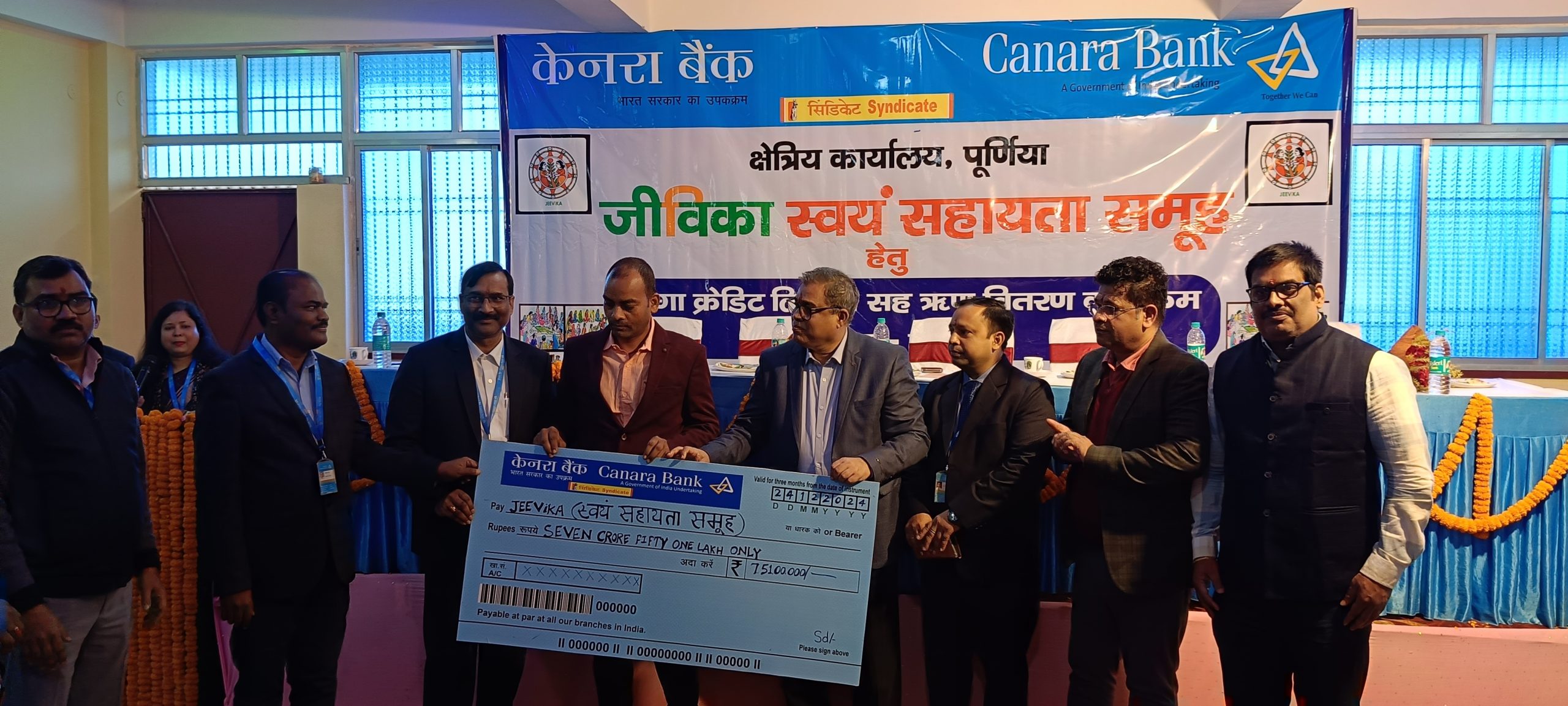 – महिला सशक्तिकरण को बढ़ावा देने को लेकर किया गया ऋण वितरण प्रतिनिधि, कोढ़ा प्रखंड क्षेत्र के गेड़ाबाड़ी के चंपा भवन में केनरा बैंक क्षेत्रिय कार्यालय पूर्णिया की ओर से जीविका स्वयं सहायता समूह के लिए मेगा क्रेडिट लिंकेज सह ऋण वितरण कार्यक्रम का आयोजन किया गया. कार्यक्रम का उद्घाटन उप महाप्रबंधक पटना प्रमोद कुमार मंडल, सहायक महाप्रबंधक पूर्णिया सुजीत कुमार, प्रबंधक सुचीत रजक व कदम सादा, शाखा प्रबंधक रामेश्वर मंडल गेड़ाबाड़ी, प्रबंधक संजीव कुमार साह, केनरा बैंक के एचएसबीसी बिजनेस हेड आशुतोष कुमार ने संयुक्त रूप से दीप प्रज्वलित कर किया. इस अवसर पर केनरा बैंक के फाउंडर अममेम्बल सुब्बाराव पाई के तेल चित्र पर पुष्प अर्पित कर भावभीनी श्रद्धांजलि अर्पित की गयी. इस मौके पर जीविका स्वयं सहायता समूह के बीच सात करोड़ 51 लाख रुपये का चेक वितरण किया गया. इस दौरान मौजूद जीविका दीदियों को संबोधित करते हुए उप महाप्रबंधक प्रमोद कुमार ने कहा कि पर्सनल आर्थिक उन्नति से समाज की उन्नति नहीं होती, बल्कि समाज की उन्नति से देश की उन्नति होती है. युग में महिलाएं नारी सशक्तिकरण को लेकर अत्यधिक जागरुक है. जिसमें जीविका की दीदियों का अहम योगदान रहा है. इसलिए केनरा बैंक के द्वारा जीविका दीदी को और मजबूत बनाने को लेकर ऋण मुहैया कराया जा रहा है. सहायक महाप्रबंधक क्षत्रिय कार्यालय पूर्णिया सुजीत कुमार ने जीविका समूह के दीदियों को संबोधित करते हुए कहा कि केनरा बैंक के द्वारा आर्थिक रूप से सशक्त व समृद्ध बनाने के लिए अपने रोजगार को बढ़ावा देने के लिए इस तरह के कार्यक्रम का आयोजन किया जाता है. वह समझ में एक अपनी पहचान के साथ मिसाल कायम कर सकें. बैंकों से प्रधानमंत्री सुरक्षा बीमा योजना एवं प्रधानमंत्री जीवन ज्योति योजना में लाभ को लेकर केनरा बैंक ऐसी बैंक है जो की किसी भी प्रकार की दुर्घटना को लेकर सरल कागजी प्रक्रिया में उन्हें लाभ दिलाने का कार्य करती है. हमलोगों का लक्ष्य है कि समाज के अंतिम पायदान पर रह रहे लोगों के बीच के महिलाओं को आर्थिक सामाजिक सशक्तिकरण पर विशेष बल देना है.कोढ़ा जीविका परियोजना के बीसीएम उत्तमानंद ने कहा कि कोढ़ा जीविका की सभी सदस्य जागरूक रूप से जीविका के द्वारा बनाए गए उत्पाद को बिहार में एक अलग पहचान देने का कार्य कर रही है. अवसर पर लगाये गये स्टॉल में सिल्की प्रोडक्ट का उप महाप्रबंधक ने प्रसन्नता जाहिर की. इस मौके पर कोढ़ा प्रखंड के सभी समूह के जीविका दीदियां व उनकी सदस्य मौजूद थी. डीपीएम पूर्णिया तरुण कुमार, बीपीएम उतमानंद कुमार, विक्रम कुमार, मौसम कुमारी आदि मौजूद थे.