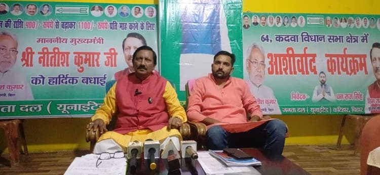 कदवा पूर्व पथ निर्माण राज्य मंत्री हिमराज सिंह ने कहा कि 23 अगस्त को आशीर्वाद कार्यक्रम का आयोजन किया गया है.गाजे बाजे व हजारों की संख्या में समर्थकों के साथ रैली निकाली जायेगी. प्रेस वार्ता कर कहा कि विपक्ष के नेता राहुल गांधी व तेजस्वी यादव का भी कार्यक्रम है लेकिन मेरा कार्यक्रम पूर्व से ही निर्धारित है. फिर भी मेरा प्रयास है कि मेरे कार्यक्रम के कारण राहुल गांधी के कार्यक्रम में किसी तरह का बाधा नहीं पहुंचे. मेरे इस आशीर्वाद कार्यक्रम का मुख्य उद्देश्य हर पंचायत जाकर लोगों से मिलकर मुख्यमंत्री द्वारा किये गये जनकल्याणकारी योजनाओं जैसे वृद्धा पेंशन का 400 रुपये से एक ग्यारह सौ रुपये होना, पूरे बिहार में 125 यूनिट बिजली का बिल्कुल मुफ्त होना, गांव के गली गली में सड़कों का होना जैसी योजनाओं का लाभ क्षेत्र के लोगों को मिल रहा है. इन सभी का श्रेय मुख्यमंत्री नीतीश कुमार को जाता है.