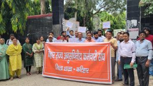 कटिहार बिहार अनुसचिवीय कर्मचारी संघ की राज्यस्तरीय सामान्य परिषद की विस्तारित बैठक में लिये गये निर्णय के आलोक में 14 सूत्री मांगों के समर्थन में कर्मियों ने तीन दिनों तक कार्यालय अवधि में काला बिल्ला लगाकर विरोध जताया. बुधवार को भी संबंधित कर्मियों ने काला बिल्ला लगाकर अपने मांगो का समर्थन किया तथा समाहरणालय गेट पर नारेबाजी की. कर्मियों ने कहा कि चरमबद्ध आंदोलन का एक चरण पूरा हो गया है अब अगले चरण के तहत आंदोलन की जायेगी. कर्मियों ने मांगों का जिक्र करते हुए कहा कि एक ही संवर्ग में नियुक्ति लिपिकों के लिए वेतन विसंगति को दूर करने के लिए सरकार ठोस कदम उठाएं. कर्मियों ने कहा कि लिपिकों के मूल पद पर नियुक्ति के लिए योग्यता मैट्रिक से बढ़ाकर इण्टरमीडिएट कर दिया गया है. पर वेतन ग्रेड-पे में कोई सुधार नही किया गया है योग्यता के अनुसार वेतन ग्रेड-पे में सुधार किया जाना चाहिए. मैट्रिक उत्तीर्ण कर्मियों का वेतन ग्रेड-पे 1900, लेवल – 02 को इण्टरस्तरीय होने के कारण मूल कोटि का वेतन ग्रेड-पे 2800 लेवल – 05 किया जाय एवं लिपिकीय संवर्ग के वेतन संरचना उसके अनुरूप किया जाय.