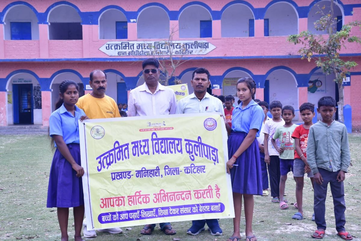 मनिहारी मनिहारी के उतक्रमित मध्य विधालय कुलीपाड़ा गांधीटोला में बिहार दिवस पर कई कार्यक्रम का आयोजन किया गया. विधालय के बच्चो ने प्रभातफेरी निकाली. विधालय प्रधानाध्यापक बद्री रजक ने बिहार के गौरवशाली इतिहास की जानकारी बच्चों को दी. मौके पर शिक्षक संजय कुमार मंडल, विधालय शिक्षा समिति अध्यक्ष रोहित पासवान, मंटू पासवान आदि मौजूद थे. मनिहारी के कई स्कूल में बिहार दिवस पर भाषण प्रतियोगिता का आयोजन किया गया. बच्चों को पुरूस्कृत किया गया. बिहार दिवस को लेकर विधालय के छात्र व छात्रों में काफी उत्साह था.