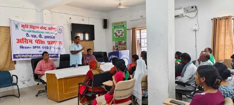 – मूंग फसल उगाने से मिट्टी की बढ़ती है उर्वरता कटिहार कृषि विज्ञान केन्द्र कटिहार में टीएसपी अग्रिम पंक्ति प्रत्यक्षण अंतर्गत मूंग की वैज्ञानिक खेती विषय पर जनजातीय कृषकों के लिए एक दिवसीय प्रशिक्षण कार्यक्रम का आयोजन किया. उद्घाटन वरीय वैज्ञानिक सह प्रधान डॉ राजीव सिंह ने किया. उन्होंने बताया कि मूंग वायुमंडलीय नाइट्रोजन को स्थिर करने की क्षमता रखती है. यह कार्य राइजोबियम नामक सहजीवी जीवाणुओं की सहायता से होता है. राइजोबियम जीवाणु, मूंग की जड़ों में गाठों का निर्माण करते हैं. मूंग फसल उगाने से मिट्टी की उर्वरता बढ़ती है. अगली फसल को अतिरिक्त नाइट्रोजन की आवश्यकता कम होती है. यह प्राकृतिक रूप से जैविक उर्वरक का कार्य करती है. उन्होंने बताया कि मूंग की उन्नत प्रभेद शिखा जनजातीय किसानों को अग्रिम पंक्ति प्रत्यक्षण अंतर्गत उपलब्ध कराया जा रहा है. प्रभेद की औसत उपज 11 से 12 क्विंटल प्रति हेक्टेयर है. यह किस्म 65 से 70 दिनों में पक कर तैयार हो जाती है. कृषि वैज्ञानिक डॉ सुशील सिंह ने बताया कि मूंग फसल के लिए खेत की तैयारी करते समय खेत की दो से तीन जुताई कर पाटा चला देना चाहिए. जुताई के समय गोबर की सड़ी हुई खाद पांच टन प्रति हेक्टेयर की दर से खेत में अच्छी तरह से मिला देना चाहिए. बुवाई के 24 घंटे पूर्व 2.5 ग्राम फफूंदनाशी दवा जैसे डाईफ़ॉल्टआन अथवा था. बुवाई के ठीक पहले फफूंदनाशी दवा से उपचारित बीजों को रायजोबियम कल्चर एवं पीएसबी से उपचारित कर बुवाई करनी चाहिए. बुवाई में पंक्ति से पंक्ति की दूरी 30 से मी रखनी चाहिए. कृषि वैज्ञानिक पंकज कुमार ने बताया कि मूंग के खेत में खरपतवार होने पर फसल का खरपतवार से प्रतिस्पर्धा बढ़ती है. इसका प्रतिकूल असर उत्पादन पर पड़ता है. पहली निकाई गुड़ाई बुवाई के 25 से 30 दिनों के भीतर करना चाहिए. रासायनिक विधि से खरपतवार नियंत्रण के लिए पेंडीमेथलीन की तीन लीटर या बासालीन की दो लीटर मात्रा प्रति हेक्टेयर की दर से बुवाई के उपरांत अंकुरण के पूर्व छिड़काव करना चाहिए. साथ ही उन्होंने पौध संरक्षण की प्रक्रिया पर भी प्रकाश डाला. इस अवसर पर विभिन्न प्रखंडों से आये 60 महिला एवं पुरुष किसानों ने अपनी सहभागिता दी.