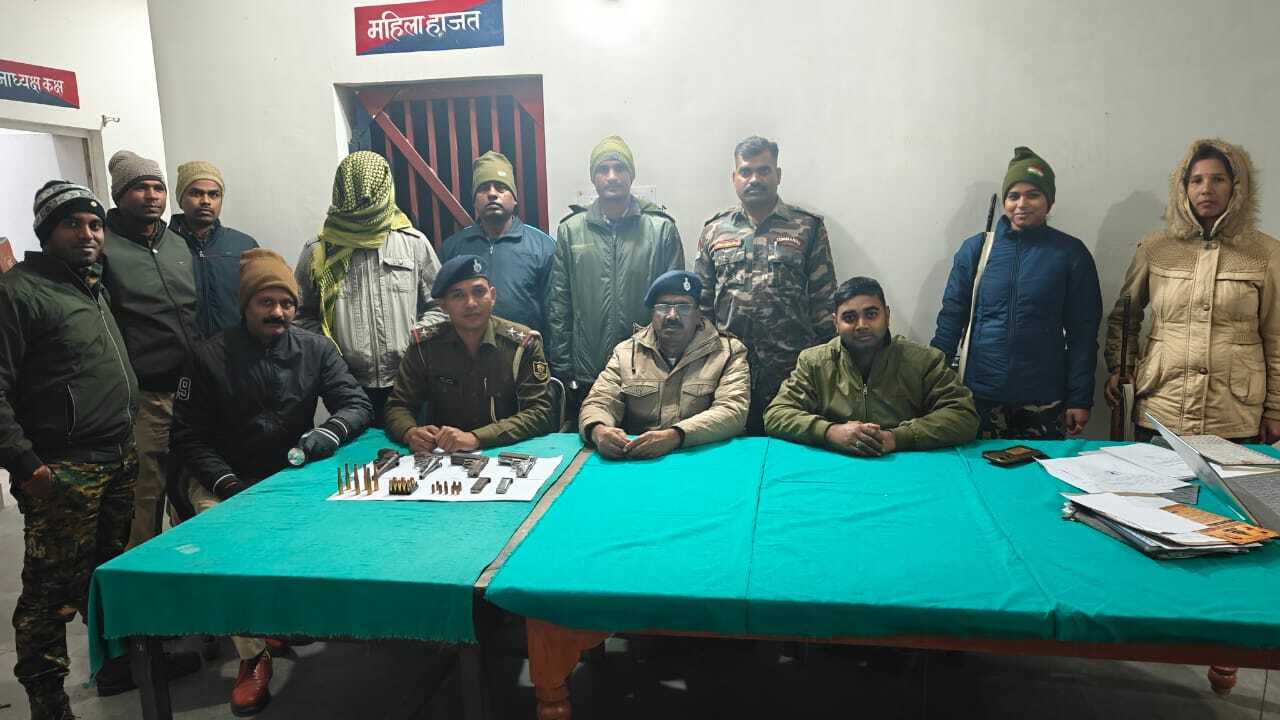 फोटो 27 कैप्शन- बरामद हथियार के साथ पुलिस पदाधिकारी प्रतिनिधि बरारी थाना क्षेत्र के पश्चिमी बारीनगर पंचायत में गुप्त सूचना के आधार पर मिलिक टोला मरघीया से अमन कुमार को एवं दो देसी पिस्टल, दो देसी कट्टा, दो मैगजीन, कारतूस रखने वाला प्लास्टिक का एक चार्जर, 7.65 का 09 कारतूस, 45 ऑटो एवं एस एण्ड बी के 08 कारतूस, 08 एमएम के एफ का 07 कारतूस भारी मात्रा में बरामदी की गयी. इसके साथ गिरफ्तार अपराधी अमन कुमार के विरूद्ध बरारी थाना कांड सख्या 357/25 धारा 25(1-बी) ए/26 आर्म्स एक्ट दर्ज कर अभियुक्त को जेल भेजा गया. इतनी बड़ी कार्रवाई से क्षेत्र में हड़कंप है. जबकि आमलोग राहत महसूस कर रहे है.