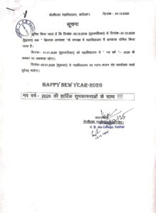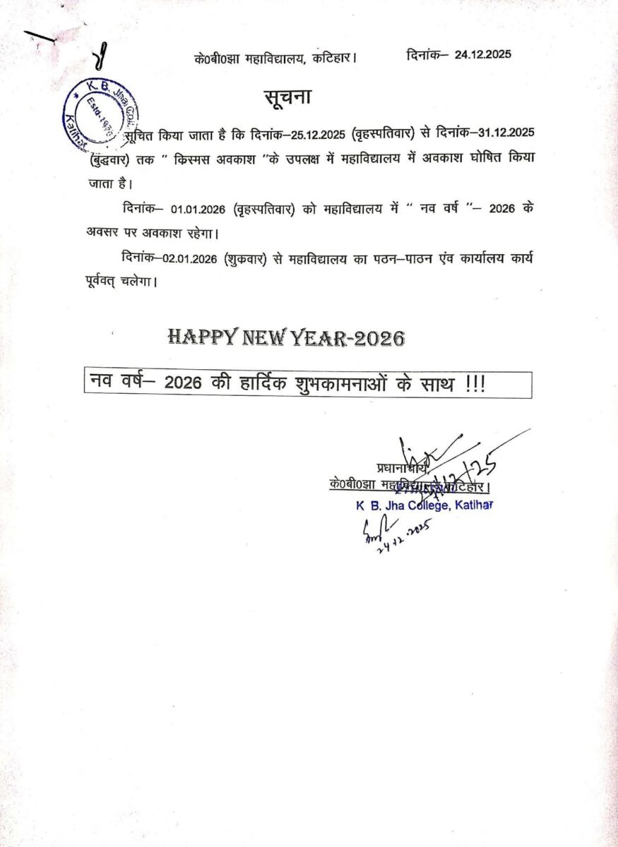 कटिहार 24 दिसम्बर से महाविद्यालयों में अवकाश घोषित कर दिया गया. अब महाविद्यालय दो जनवरी को खुलेगा. इसके लिए अलग-अलग महाविद्यालयों में नोटिस जारी कर दिया गया. इन सबके बीच केबी झा कॉलेज प्रबंधन व प्रशासन की ओर से अवकाश के लिए 24 दिसम्बर को जारी नोटिस में हैप्पी न्यू ईयर 2026 दर्शाने के बाद हास्यास्पद बना हुआ है. अलग-अलग छात्र संगठनों में अभाविप के विक्रांत सिंह, एनएसयूआई के अमित पासवान समेत अन्य का कहना है कि ऑफिसियल नोटिस में सात दिन पूर्व हैप्पी न्यू ईयर 2026 लिखना परिपारटी को बदलने का प्रयास किया जा रहा है. उनलोगों का कहना है कि नोटिस में 25 दिसम्बर गुरूवार से 31 दिसम्बर बुधवार तक क्रिसमस अवकाश के उपलक्ष्य में महाविद्यालय में अवकाश घोषित किया जाता है. एक जनवरी गुरूवार को महाविद्यालय में नववर्ष 2026 के अवसर पर अवकाश रहेगा. दो जनवरी शुक्रवार से महाविद्यालय का पठन पाठन एवं कार्यालय कार्यपूर्ववत चलेगा. इसके बाद अंग्रेजी में हैप्पी न्यू ईयर 2026 व हिन्दी में नववर्ष 2026 की हार्दिक शुभकानाओं के साथ दर्शया गया है. साथ ही कॉलेज के प्राचार्य व प्रधान सहायक का हस्ताक्षर व मोहर लगाया गया है. उनलोगों ने बताया कि नये वर्ष के सात दिन पूर्व इस तरह नोटिस में दर्शाना कहीं न कहीं मजाक समझा जायेगा या फिर अज्ञानता का द्योतक. उनलोगों ने इसको लेकर विवि प्रशासन का ध्यान आकृष्ट कराते हुए इसे सुधार कर लिखने की मांग की है.