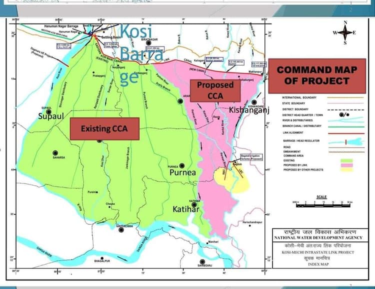 जल संसाधन विभाग की ओर से जानकारी दी गयी है कि कोसी-मेची अंतर्राज्यीय नदी जोड़ परियोजना के माध्यम से कोसी नदी के अधिशेष जल को महानंदा बेसिन में पहुंचाकर, जहां चार जिलों के बड़े क्षेत्र में सिंचाई सुविधा पहुंचायी जायेगी. वहीं कोसी नदी की बाढ़ का प्रभाव भी कम होगा. योजना के तहत पूर्वी कोसी मुख्य नहर के 0.00 किमी से 41.30 किमी तक वर्तमान जल संवहन क्षमता को 15 हजार क्यूसेक से बढ़ा कर 20 हजार क्यूसेक किया जायेगा, जबकि मुख्य नहर का इसके अंतिम बिंदु यानी 41.30 किमी से 117.50 किमी तक विस्तार किया जायेगा. साथ ही कुल चार शाखा नहर (लंबाई 229.00 किमी) और छह वितरणी (लंबाई 48.00 किमी) के साथ पांच क्यूसेक तक की नहर प्रणालियों का निर्माण कराया जायेगा. नहर के अंतिम छोर (किशनगंज जिले के माखनपुर गांव) पर 950 क्यूसेक जलस्राव प्रवाहित होगा, जो मेची नदी में मिलेगा.डिस्क्लेमर: यह प्रभात खबर समाचार पत्र की ऑटोमेटेड न्यूज फीड है. इसे प्रभात खबर डॉट कॉम की टीम ने संपादित नहीं किया है