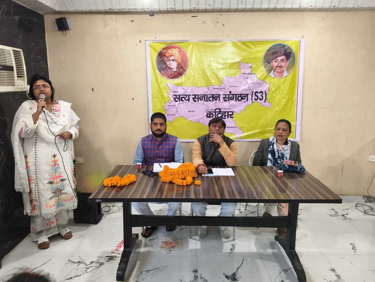 कटिहार कटिहार के एक होटल के सभागार में सत्य सनातन संगठन (एसथ्री) की स्थापना बैठक हुई. बैठक में सर्वसम्मति से सभी को दायित्व दिया गया. साथ ही कई मुद्दों को लेकर विचार विमर्श की गयी. इस दौरान संस्थापक महेन्द्र झा को सर्वसम्मति से केन्द्रीय अध्यक्ष एवं मनोज राय को मुख्य संरक्षक चुना गया. सामाजिक-राजनीतिक विषयों पर रणनीतिक मंच प्रदान करना है. कटिहार में मखाना बोर्ड, एम्स जैसी संस्थाओं की स्थापना के लिए जनजागरण लाना है. विचार किया गया कि सनातनी विचारधारा के वाहकों की अधिकाधिक भागेदारी को त्रिस्तरीय पंचायती व्यवस्था में सुनिश्चित करना है. मौके पर राघवेन्द्र सिंह, शोभा जायसवाल, शोभन दास, अजय दास, सौरभ मालाकार, नरेश मंडल, मिथुन चौधरी, श्याम माहेश्वरी, अविनाश झा, शोभन दास, मनीषा महतो, श्वेता राय, चांदनी जायसवाल, रीना झा, प्रियंका सिंह, रूचि चौधरी, रितेश सिन्हा, आशीष झा, दीपक पासवान, संजीव त्रिवेदी, विशाल वर्मा, सौरभ कुलकर्णी, राजन शर्मा, अमर राय, जोक्सन यादव, अंकित मालाकार, आदित्य कृष्णा, सन्नी तांती, गौरव मिश्रा मौजूद थे,