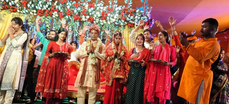 आजमनगर प्रखंड मुख्यालय स्थित खेल मैदान प्रांगण में बजरंग दल एवं विश्व हिन्दू परिषद ने सामूहिक विवाह समारोह का आयोजन किया. लगभग आधा दर्जन वर-वधु का सामूहिक विवाह कराया गया. वर-वधु के परिजनों के अलावा कई स्थानीय लोग मौजूद थे. वैदिक मंत्रोच्चार एवं गाजे बाजे के साथ सामूहिक विवाह बड़े ही धूम धाम से संपन्न हुआ. आजमनगर बजरंग दल के सनातन पोद्दार ने कहा कि आपसी सहयोग से कन्या दान का कार्य किया. आर्थिक रूप से पिछड़े परिवार की लड़कियों का विवाह बिना किसी दहेज के संपन्न कराया. आजमनगर के कई समाज सेवियों का भरपूर सहयोग रहा. लड़कियों के परिजनों ने बताया कि आर्थिक तंगी के कारण लड़की की शादी बोझ लग रही थी. बजरंग दल और विश्व हिन्दू परिषद ने बेटी की शादी का खर्चा उठा लेने से बड़ी जिम्मेदारी का निर्वहन आसानी से हो गया. साथ हीं बड़ी सादगी से बेटी का विवाह बिना किसी दहेज के संपन्न हो गया. इस दौरान आयोजकों में आनंद कुमार केसरी, चिंटू कुमार भगत, राजेश कुमार उर्फ गुड्डू बाबा, निखिल कुमार भगत, रॉकी पोद्दार, हिमांशु कुमार भगत, प्रियांशु कुमार भगत, अभी कुमार भगत, रोशन कुमार भगत, अभिषेक केसरी, संजय राय उर्फ भोला राय आदि मौजूद रहे.