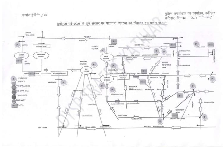 कटिहार दुर्गापूजा पर्व के अवसर पर कटिहार शहर में यातायात व्यवस्था का संचालन एवं वैकल्पिक मार्गो की व्यवस्था जारी कर दी गयी है. 28 सितंबर से 03 अक्तूबर 2025 तक संध्या 04:00 बजे से सुबह 04:00 बजे तक वाहनों का परिचालन जारी किये गये रूट के अनुसार ही किया जायेगा. इस प्रकार से शहर में बनाये गये रूट चार्ट 1. शहीद चौक से दुर्गा मंदिर जाने वाले वाहन का पार्किंग मंगल बाजार स्थित डाकबंगला व महेश्वरी एकेडमी इंडोर स्टेडियम में होगा. जहां से श्रद्वालु पैदल रास्ते से दुर्गा मंदिर जायेंगे. वापसी में उक्त वाहन हरदयाल चौक पानी टंकी होते हुए एमजी रोड तथा शहीद चौक की ओर आयेंगे. 2. शहीद चौक से मुफ्फसिल थाना क्षेत्र की ओर जाने वाले श्रद्धालु अपने वाहन से बाटा चौक, न्यू मार्केट, अनाथालय रोड, चन्द्रमा चौक होते हुए मुफ्फसिल की ओर निकलेंगे. जबकि मुफ्फसिल की ओर से आने वाले वाहन का पार्किंग केबी झा कॉलेज में होगा. जहां से श्रद्वालु पैदल ही दुर्गा मंदिर जायेंगे तथा वैसे वाहन (केवल दो पहिया) जो एमजी रोड आना चाहते है. वे अनाथालय रोड होते हुए हरदयाल चौक होते हुए पानी टंकी वाले रास्ते से होकर एमजी रोड होते हुए शहीद चौक तक जायेंगे. 3. सुरतुलसी कॉलेज मोड़ के पास से आने वाले तीन पहिया एवं बड़े वाहन का पार्किंग डीएस कॉलेज होगा. जहां से केवल दो पहिया वाहन पटेल चौक, हरदयाल मोड़ होते हुए महेश्वरी एकेडमी में अपना वाहन पार्क कर पैदल ही दुर्गा स्थान जायेंगे. 4. शहीद चौक से संग्राम चौक तक जाने वाले वाहन मंगल बाजार स्थित डाकबंगला पार्किंग, रेलवे स्टेशन पार्किंग में वाहन पार्क कर संग्राम चौक तक जायेंगे. जहां से वे ड्राईवर टोला, केबी झा कॉलेज होते हुए दुर्गा स्थान जायेंगे. 5. शहीद चौक से एलडब्लूसी क्लब जाने वाले वाहन का पार्किंग राजेन्द्र स्टेडियम तथा नगर निगम में होगा. जहां से आगे केवल दो पहिया वाहन जायेंगे, जो कालीबाड़ी, पावर हाउस, मेयर हाउस से दाये होकर अरगड़ा चौक तक जायेंगे तथा वापसी में अरगड़ा चौक स्थित सुलभ शौचालय के बगल स्थित रास्ते से होकर जुट मिल, महिला कॉलेज, पावर हाउस मोड़ होते हुए राजेन्द्र स्टेडियम के रास्ते शहीद चौक जायेंगे. 6. अरगडा चौक से एलडब्लूसी क्लब की ओर का रास्ता केवल पैदल श्रद्वालुओं के लिये खुला रहेगा. जबकि मनिहारी तथा शरीफगंज की ओर से एलडब्लूसी क्लब आने वाले बड़े वाहन का पार्किंग नाका नं -02 के पास होगा तथा जहां से आगे केवल दो पहिया वाहन जायेंगे, जो आगे झुलनिया मोड़ के पास स्थित जुट मिल में वाहन पार्क कर पैदल एलडब्लूसी क्लब जायेंगे. 7. मनिहारी से सहायक थाना की ओर जाने वाले वाहनों का पार्किंग बरमसिया स्थित मैदान में होगा. 8. कोलासी की ओर से शहर की ओर आने वाले वाहन का पार्किंग एससी-एसटी महिला थाना कैम्पस में होगा. इसके आगे शहर क