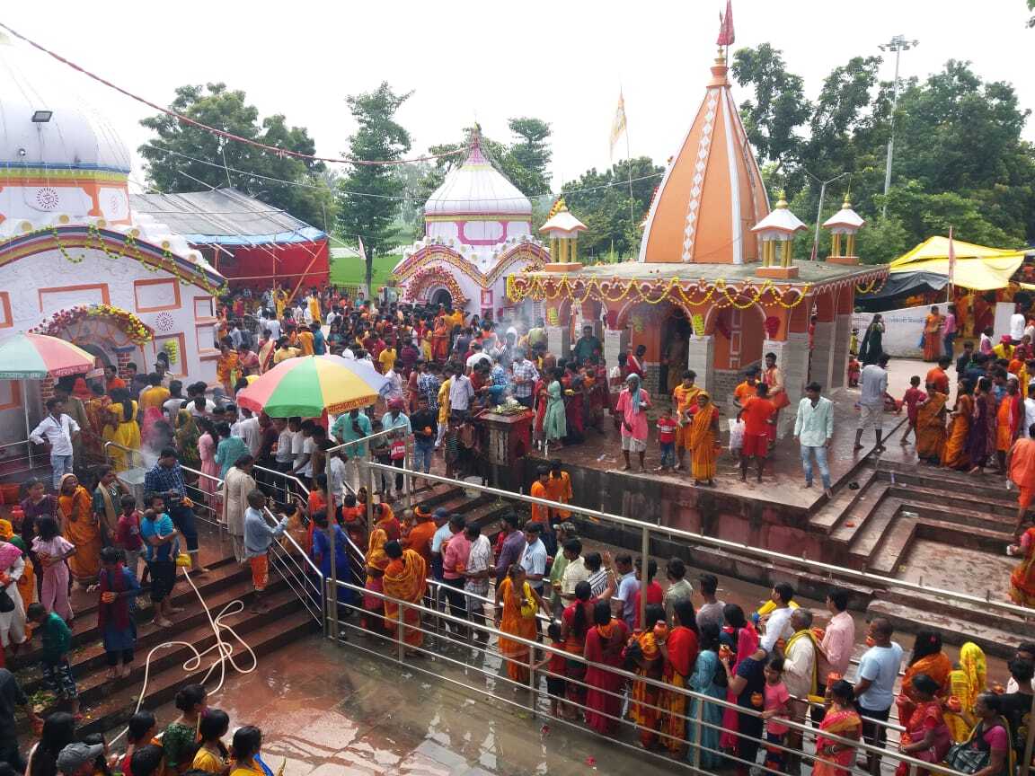 बलिया बेलौन श्रावणी पूर्णिमा के अवसर पर मिनी बाबा धाम के नाम से प्रसिद्ध गोरखनाथ धाम मंदिर में शिव भक्तों की भीड़ उमड़ पड़ी. करीब पांच लाख श्रद्धालुओं ने गोरखनाथ धाम में जल अर्पित कर अपनी मनोकामना पूरी होने के लिए बाबा गोरखनाथ से आशिर्वाद प्राप्त किया. बोल-बम कांवरियों ने मनिहारी से गंगा जल भर कर पैदल बाबा गोरखनाथ धाम पहुंच कर जल अर्पित किया. शुक्रवार की शाम से श्रद्धालुओं का आना प्रारंभ होने के बाद रात भर श्रद्धालुओं के आने का सिलसिला जारी रहा. शनिवार की सुबह तक यह सिलसिला जारी रहा. एसडीओ दीक्षित श्र्वेतम, एसडीपीओ अजय कुमार, सीओ रिजवान आलम, थानाध्यक्ष राजेश कुमार दल-बल के साथ उपस्थित रह कर श्रद्धालुओं की सुविधा पर विशेष ध्यान दिये. यहां दूर दराज से पश्चिम बंगाल, झारखंड, ओडिशा सहित पड़ोसी देश नेपाल, भुटान से भी शिवभक्त पहुंचे थे. पूजा को लेकर महिलाओं एवं युवतियों में खासा उत्साह देखा गया. बोलबम कांवरियों ने सुख शांति के लिए बाबा गोरखनाथ धाम में पूजा कर अपनी मनोकामना पूर्ण होने के लिए आशीर्वाद मांगा. बाबा गोरखनाथ धाम केसरिया रंगों से पटा रहा. ओम नमः शिवाय एवं बोल बम के जयकारे के बीच भक्तों ने शिवलिंग पर जलाभिषेक कर पूजा अर्चना की. सालमारी बाजार भी कांवरियों से भरा रहा. जगह- जगह बोलबम सेवा शिविर लगाया था. बाबा गोरखनाथ धाम में करीब पांच लाख की संख्या में शिवभक्तों ने जल अर्पित किया. कमेटी के सचिव पिंटू यादव, उपाध्यक्ष अक्षय सिंह, निरंजन यादव, फन्नी सिंह, देवनारायण नुनिया, सन्नी यादव, पंचा यादव, लालू दास, मिथुन यादव, राधाकांत घोष, राजू घोष, प्रशांत सिंह, बिट्टू सिंह, रामबिलास शर्मा, चन्दन यादव, गुड्डू शर्मा, कार्तिक साह, शंकर राय, शौरभ यादव, अंकित यादव, फनी दास आदि कमेटी के अन्य सदस्यों का पूर्ण सहयोग रहा.