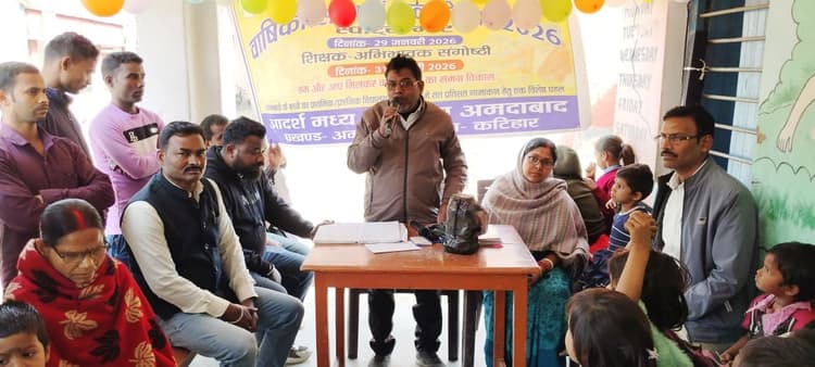 आदर्श मध्य विद्यालय अमदाबाद प्रांगण में प्रधानाध्यापक राजकुमार सिंह की अध्यक्षता में संबद्ध आंगनबाड़ी सेविका, सहायिका के सहयोग से वार्षिकोत्सव व शिक्षक, अभिभावक संगोष्ठी का आयोजन किया गया