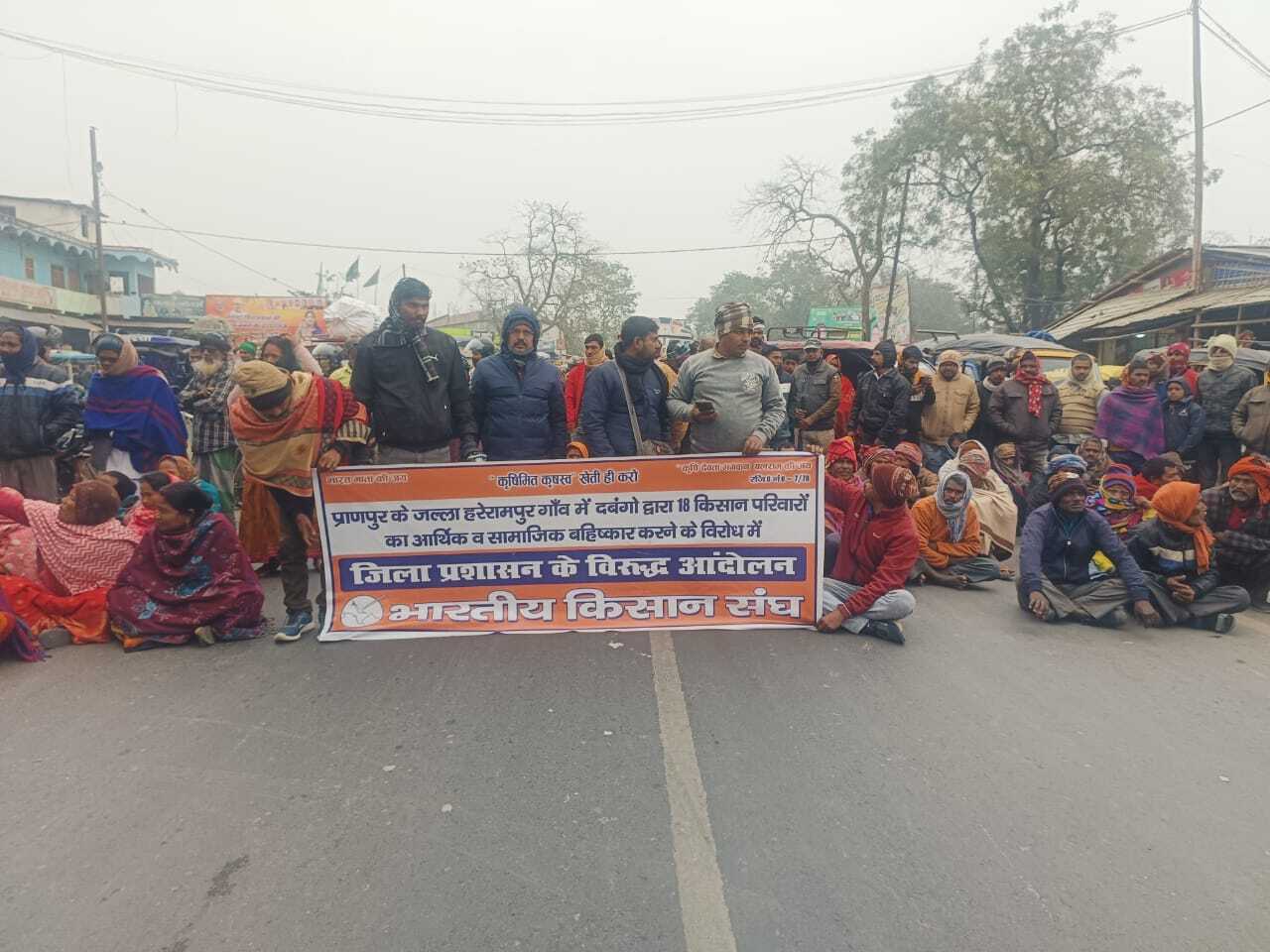 – खेत तक किसानों के नहीं पहुचने से सिंचाई के अभाव में बरबाद हो रही फसल – मामले में पुलिस प्रशासन की चुप्पी से किसानों में आक्रोश प्राणपुर थाना क्षेत्र के बस्तौल चौक के समीप एनएच 81 मुख्य सड़क पर भारतीय किसान संघ के बैनर तले भारतीय किसान संघ के प्रखंड अध्यक्ष ओमेश मंडल की अध्यक्षता में मांगों के समर्थन में करीब दो घंटे तक एनएच 81 मुख्य सड़क जाम कर प्रदर्शन किया. सड़क के दोनों ओर वाहनों की लंबी कतारें लग गयी. इससे यात्रियों को भारी परेशान उठानी पड़ी. उत्तर बिहार प्रांत भारतीय किसान संघ के महामंत्री मनोज कुमार गुप्ता, भारतीय किसान संघ के वरिष्ठ कार्यकर्ता विष्णुदेव मंडल, सौपाल सरकार, सुदर्शन कुमार, रतन किसकु, विधान चंद्र सरकार, राजेश मंडल एवं सुधरी महतो सहित दर्जनों कार्यकर्ता ने बताया कि प्राणपुर थाना क्षेत्र के जलला हरिरामपुर गांव के अठारह किसान परिवार का तकरीबन तीस एकड़ जमीन पर लगा मक्का फसल को सिंचाई के अभाव में दबंगों के द्वारा नष्ट किया जा रहा है. साथ ही नाव पर चढ़ने पर मना किया जा रहा है. किसानों को आर्थिक एवं सामाजिक बहिष्कार किया जा रहा है. जिसके विरुद्ध सैकड़ों किसानों ने प्राणपुर थाना क्षेत्र के बस्तौल चौक के समीप एनएच 81 मुख्य सड़क पर शांति पूर्ण तरीके से बैठ कर तकरीबन दो घंटा तक जाम कर विरोध प्रदर्शन किया. भारतीय किसान संघ ने एनएच 81 मुख्य सड़क को जाम करने से यातायात पूरी तरह से बाधित रहा. यात्रियों को भारी परेशानी का सामना करना पड़ा. जानकारी मिलते ही प्राणपुर पुलिस बल के साथ धरना स्थल पर पहुंच कर मामला को संज्ञान में लेते हुए अग्रिम कार्रवाई करने का आश्वासन दिया. समझाने बुझाने पर प्राणपुर थाना अध्यक्ष रंजीत कुमार महतो के प्रयास से जाम हटाया गया. इस मौके पर सैकड़ों किसान मौजूद थे.