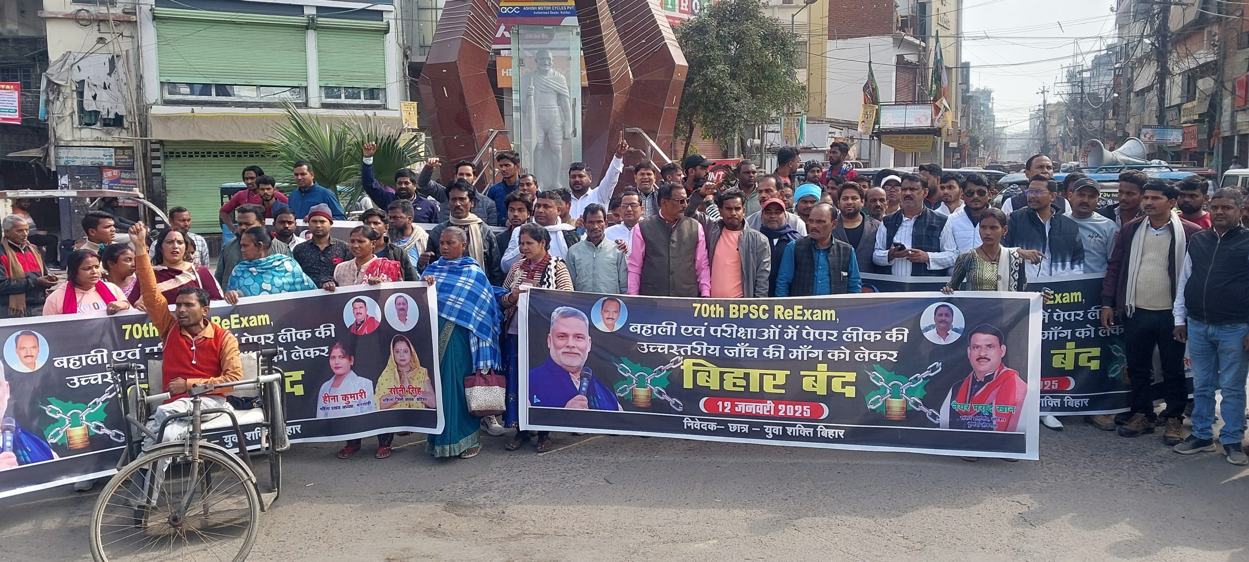 – समर्थकों ने शहीद चौक को जाम कर किया विरोध-प्रदर्शन बाजार व अन्य जगहों में समर्थकों ने बंद कराई दुकानें कटिहार बीपीएससी परीक्षा रद्द करने और री-एग्जाम की मांग को लेकर बिहार में सियासी घमासान जारी है. इसी कड़ी में रविवार को पूर्णिया सांसद पप्पू यादव ने रविवार को बिहार बंद का आहवान किया थ. कटिहार जिले में बिहार बंद का मिलाजुला असर रहा. सांसद प्रतिनिधि नैयर मसूद खान के नेतृत्व में कटिहार बंद कराया गया. सर्वप्रथम सुबह शहीद चौक से मिरचाईबाड़ी जाने वाली मुख्य सड़क को समर्थकों ने बाधित कर दिया. सभी ने जमकर बिहार सरकार के खिलाफ नारेबाजी भी की. समर्थकों ने शहर में घूम-घूम कर दुकान को भी बंद कर छात्रों का साथ देने की अपील की. दुकानदारों ने अपनी दुकान कुछ देर के लिए बंद कर अपना साथ जरूर दिया. कुछ देर के लिए ही सही लेकिन कटिहार शहर में बंदी का मिला-जुला असर जरूर रहा. नैयर मसूद खान ने कहा कि जब तक बीपीएससी अभ्यर्थियों को न्याय नहीं मिल जाता प्रदर्शन जारी रहेगा. उन्होंने कहा कि बिहार की परीक्षा में छात्रों के भविष्य के साथ लगातार खिलवाड़ हो रहा हैं. पेपर लीक की घटनाओं ने पूरे सिस्टम पर सवाल खड़े कर दिए हैं. बिना सरकार और पदाधिकारियों की मिलीभगत के पेपर लीक होना संभव है ही नहीं है. पूरा सिस्टम करप्ट हो गया है. जाप के पूर्व प्रदेश महासचिव वकील दास ने कहा कि बिहार सरकार की यह कैसी व्यवस्था है. बीपीएससी हो सिपाही भर्ती, क्लर्क परीक्षा या मेडिकल परीक्षा में लगातार पेपर लीक हो रही है. सरकार आखिरकार क्या कर रही है. पूर्व जिलाध्यक्ष अरूण सिंह ने कहा कि बिहार का कोई भी प्रतियोगी परीक्षा पारदर्शी और निष्पक्ष तरीके से नहीं हो पाता है. सभी परीक्षा का प्रश्न पत्र लीक हो जाना बिहार के छात्रों के भविष्य के साथ खिलवाड़ हो रहा है. इस अवसर पर सोनी सिंह, तनवीर शम्सी, किशोर यादव, तौसीफ अख्तर, सुनील भारती, रवि यादव, कासिफ खान, अजय पोद्दार, दीपक चौहान, अनिल दास, शैलेश दास, संजय सवल, तफसील, इंद्र देव सिंह, ऐनुल, इम्तियाज, करण रॉय, कृष्णा यादव, अब्दुल स्कीम, अंकित शर्मा, अंकित यादव आदि मौजूद रहे. बाइक सवार युवक के साथ की गयी मारपीट —————————————————– बिहार बंद के दौरान एक बाइक सवार युवक के बंदी के विरोध में कुछ बोलने पर बंद समर्थकों ने मारपीट की घटना को अंजाद दिया. हालांकि वहां मौजूद सांसद प्रतिनिधि नैयर मसूद खान व अन्य वरिष्ठ लोगों ने बीच बचाव कर युवक को वहां से जाने को कहा. तब जाकर मामला शांत हुआ.