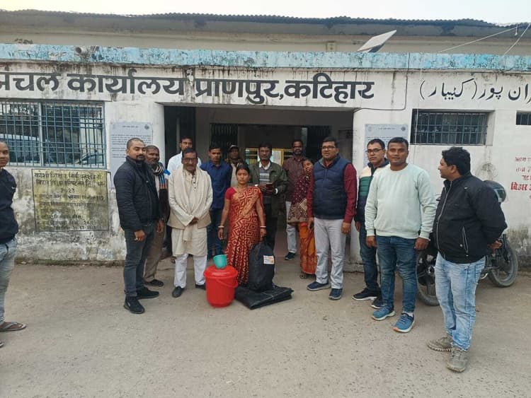 प्राणपुर प्रखंड मुख्यालय परिसर में अंचल पदाधिकारी ने शिविर आयोजित कर अग्नि पीड़ित परिवारों के बीच राहत सामग्री का वितरण किया. अंचल पदाधिकारी इस्लाम अंसारी ने बताया कि पिछले दिनों प्राणपुर थाना क्षेत्र के जल्ला हरिरामपुर वार्ड नंबर 13 में अचानक आग लग गयी थी. जिसमें एक परिवार का एक घर जल कर राख हो गया था. जिसको लेकर जिला पदाधिकारी कटिहार के आदेशनुसार जल्ला हरिरामपुर के अग्नि पीड़ित परिवार कारी कुमारी पति भारत सिंह, जल्ला हरिरामपुर, प्राणपुर निवासी के बीच राहत सामग्री का कीट वितरण किया गया. जदयू प्रखंड अध्यक्ष लड्डू सिंह, पंचायत समिति सदस्य अजमल, राजस्व पदाधिकारी अजय कुमार सिंह, प्रधान सहायक राज किशोर, सौरभ कुमार सिंह के साथ दर्जनों समाजसेवी मौजूद थे.