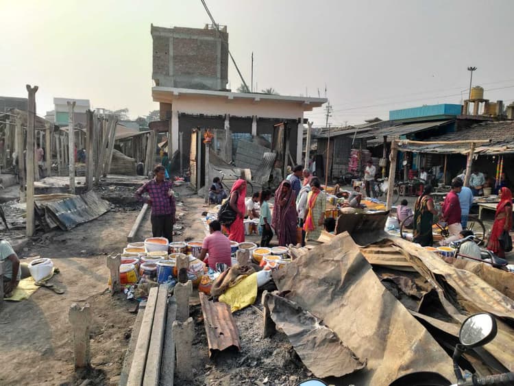 हाट में खुले आसमान के नीचे जले कचरे पर सजायी दुकानें