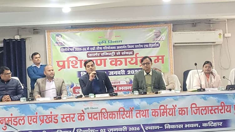 – स्टैक परियोजना अंतर्गत फार्मर रजिस्ट्री से संबंधित एक दिवसीय प्रशिक्षण का आयोजन कटिहार विकास भवन के उपरी सभाकक्ष में शुक्रवार को स्टैक परियोजना अंतर्गत फार्मर रजिस्ट्री से संबंधित एक दिवसीय प्रशिक्षण का आयोजन किया गया. प्रशिक्षण का उद्घाटन जिलाधिकारी आशुतोष द्विवदी ने दीप जलाकर किया. फार्मर रजिस्ट्री से संबंध, भूमि सुधार उपसमाहर्ता, अनुमंडल स्तरीय कृषि पदाधिकारी, प्रखंड स्तरीय सभी अंचलाधिकारी, सभी राजस्व कर्मचारी कृषि विभाग के सभी कृषि समन्वयक, प्रखंड तकनीकी प्रबंधक, सहायक तकनीकी प्रबंधक एवं किसान सलाहकार उपस्थित थे. जिला कृषि पदाधिकारी मिथिलेश कुमार ने बताया कि प्रधान सचिव कृषि विभाग बिहार सरकार द्वारा एग्री स्टैक परियोजना के तहत फार्मर रजिस्ट्री के कायों में प्रगति लाने के लिए मिशन मोड में कैंप आयोजित कर जिले के किसानों का फार्मर आइडी तैयार किये जाने का निदेश है. फार्मर रजिस्ट्री कार्य के लिए सभी पंचायतों में दो चरणों में कैम्प लगाना है.इस कार्य के लिए पंचायत स्तरीय कृषि कर्मी राजस्व एवं भूूमि सुधार के पदाधिकारी व कर्मी शामिल होंगे. पंचायत स्तरीय कर्मी को निर्धारित तिथि को कैम्प के माध्यम से फार्मर रजिस्ट्री कार्य कराने के लिए व्यापक प्रचार प्रसार करने का निर्देश दिया. जिला पदाधिकारी ने सभी राजस्व कर्मचारी व कृषि कर्मियों को निर्देश दिया कि आपसी समन्वय स्थापित करते हुए प्रथम चरण छह से नौ जनवरी व द्वितीय चरण 18 से 21 जनवरी को मिशन मोड में सभी पंचायतों में कैम्प का आयोजन कर फार्मर रजिस्ट्री कार्य पूर्ण कराना सुनिश्चित करें. साथ ही फार्मर रजिस्ट्री में आने वाले भूमि सम्बंधी दावों के विवादों का समाधान कराने के साथ साथ प्रखंड स्तरीय कियान्वयन दल के पदाधिकारियों और अंचलाधिकारी को फार्मर रजिस्ट्री के कियान्वयन के लिए आवश्यक दिशा निर्देश प्राप्त है. इस अवसर पर उपविकास आयुक्त, अनुमंडलाधिकारी समेत अन्य मौजूद थे.