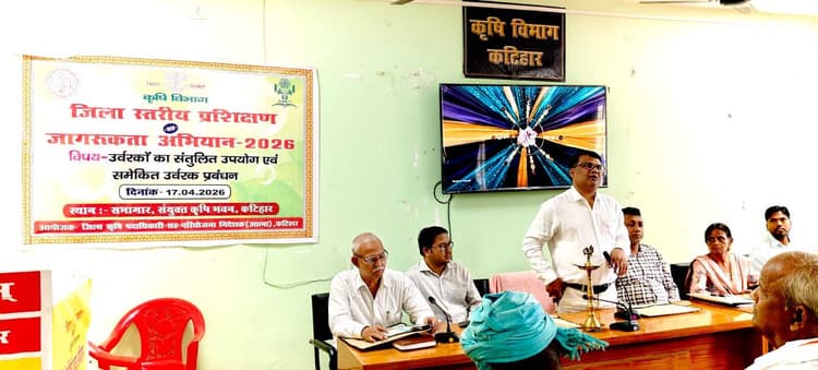 – संयुक्त कृषि भवन कटिहार के सभागार में उर्वरक के संतुलित उपयोग के लिए चलाया जागरूकता अभियान कटिहार संयुक्त कृषि भवन कटिहार के सभागार में उर्वरक के संतुलित उपयोग के लिए जागरूकता अभियान सह जिला स्तरीय प्रशिक्षण कार्यक्रम 2026 का आयोजन किया गया. जिला कृषि पदाधिकारी मिथिलेश कुमार ने दीप जलाकर उदघाटन किया. उप परियोजना निदेशक आत्मा के वैज्ञानिक, सहायक निदेशक रसायन, सभी प्रखंड तकनीकी प्रबंधक, सभी सहायक तकनीकी प्रबंधक व सभी प्रखंडों के 115 कृषकों ने भाग लिया. जिला कृषि पदाधिकारी मिथिलेश कुमार ने बताया कि कार्यक्रम का मुख्य उद्देश्य रसायनिक उर्वरकों के अंधाधुंध प्रयोग को कम कर जैविक उर्वरक को बढ़ावा देना है. रसायनिक उर्वरक के प्रयोग को संतुलन में लाया जा सके. किसानों को मिट्टी जांच कर ही उर्वरक का प्रयोग करने को लेकर अनुरोध किया. खेतों में मूंग व ढैचा को हरित खाद के रूप में प्रयोग करने की जानकारी दी. खेतों में प्राकृतिक रूप से नत्रोजन स्थिरीकरण हो सके. मिट्टी की उर्वरा शक्ति बनी रहे. उर्वरक के संतुलित उपयोग के लिए किसानों को नैनो यूरिया, नैनो डीएपी का उपयोग करने पर बल दिया. पौधे की सीधे पत्तियों के माध्यम से पोषक तत्व मिल सके और मिट्टी प्रदूषित नहीं हो. कृषि विज्ञान केन्द्र के वैज्ञानिकों ने उर्वरक के संतुलित उपयोग करने के लिए किसानों को प्रशिक्षण दिया. कैसे फसलों में उर्वरक की मात्रा का निर्धारित किया जाय. साथ ही कम रसायनिक उर्वरक का प्रयोग कर अधिक से अधिक उत्पादन प्राप्त हो सके. साथ ही फसल चक्र अपनाने को भी बताया गया.