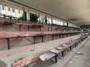 राजेंद्र स्टेडियम में बैठने के लिए लगायी गयी कुर्सियां भी टूट कर हुईं बर्बाद