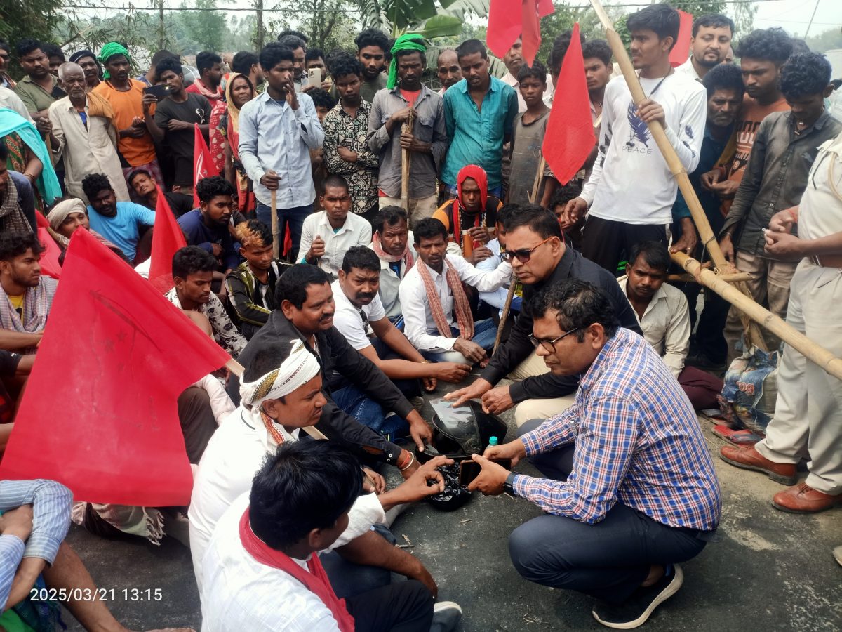 प्राणपुर बुधनगर गांव के समीप एनएच-81 मुख्य सड़क पर भाकपा माले बेनर तले सिंघिया आदिवासी टोला गांव के सैकड़ों ग्रामीणों ने बिना सुचना के जमीन मालिक का जमीन मापी करने तथा दखल कब्जा कराने पहुंचे प्राणपुर पुलिस प्रशासन के विरोध में एनएच 81 मुख्य सड़क पर टायर जलाकर सड़क जाम कर दिया. प्राणपुर थाना क्षेत्र के बुधनगर गांव के समीप एनएच 81 मुख्य सड़क पर टायर जलाकर विरोध प्रदर्शन करते हुए, भाकपा माले के वरिष्ठ नेता पप्पू कुमार राय,बिटका टूडू, ऐमूनल टूडू एवं कृत्यानंद यादव, ने बताया कि बीते वृहस्पतिवार को बिना सुचना के प्राणपुर अंचल पदाधिकारी के नेतृत्व में तकरीबन ढाई सौ पुलिस फोर्स के साथ जमीन मालिक को जमीन दखल कब्जा कराने प्राणपुर थाना क्षेत्र के सिंघिया आदिवासी टोला गांव पहुंचे थे,संयोग वश् गांव में ग्रामीण नहीं थे. विरोध में भाकपा माले बेनर तले इंसाफ कि गुहार लगाते हुए सिंघिया आदिवासी टोला गांव के सैकड़ों ग्रामीणों ने एनएच 81 मुख्य सड़क पर टायर जलाकर बांस का बल्ला घेर कर तकरीबन चार घंटा तक सड़क जाम कर विरोध प्रदर्शन किया. सड़क जाम होने कारण एन एच 81के दोनों ओर वाहनों का जाम लग गया. कटिहार जिला कार्यपालक पदाधिकारी राकेश कुमार रंजन, प्राणपुर सीओ इस्लाम अंसारी एवं प्राणपुर अंचल राजस्व पदाधिकारी अजय कुमार सिंह प्राणपुर पुलिस दल बल के साथ प्रदर्शन स्थल पर पहुंच कर ग्रामीणों को समझाते बुझाते हुए तकरीबन चार घंटा बाद एनएच 81 मुख्य सड़क के जाम को हटाया. न्यायालय के आदेश पर दंडाधिकारी के साथ पुलिस पदाधिकारी व बल के साथ विवादित भू स्थल पर गयी थी. जिसमें दोनों पक्ष के लोगों को दस्तावेज के साथ उपस्थित होने को कहा गया था.