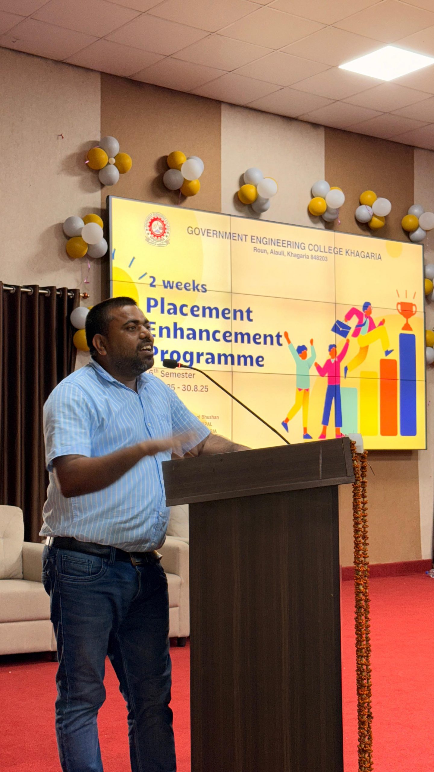 खगड़िया. राजकीय अभियंत्रण महाविद्यालय के सभागार में छठे सेमेस्टर के छात्रों के लिए दो सप्ताह का प्लेसमेंट एन्हांसमेंट प्रोग्राम प्रारंभ किया गया. कार्यक्रम में लगभग 150 छात्र-छात्राओं ने भाग लिया. महाविद्यालय के प्राचार्य डॉ मणि भूषण, प्रो अमित कुमार सिंह, प्रो इरफ़ान अंसारी, प्रो प्रियंका सिन्हा, प्रो ज्योति कुमार, प्रो अभिषेक कुमार और प्रो निशांत कुमार उपस्थित थे. प्राचार्य डॉ मणि भूषण ने विद्यार्थियों को संबोधित करते हुए कहा कि यह प्रशिक्षण उनके उज्ज्वल भविष्य के लिए अत्यंत उपयोगी साबित होगा. उन्होंने छात्रों को सक्रिय भागीदारी के लिए प्रेरित किया और यह घोषणा भी की कि उत्कृष्ट प्रदर्शन करने वाले विद्यार्थियों को पुरस्कार से सम्मानित किया जाएगा. प्रो निशांत कुमार ने प्लेसमेंट प्रोसेस ओवरव्यू पर विस्तृत व्याख्यान प्रस्तुत किया. आगामी दिनों में छात्रों को एप्टीट्यूड, लॉजिकल रीजनिंग, इंटरव्यू स्किल्स जैसी महत्वपूर्ण विषयों पर प्रशिक्षण दिया जाएगा. कार्यक्रम के अंत में कंप्यूटर बेस्ड टेस्ट और मॉक इंटरव्यू आयोजित किया जाएगा. जिससे विद्यार्थियों की वास्तविक तैयारी का आकलन किया जाएगा.
