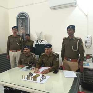 गोगरी. थाना क्षेत्र के फुदकिचक गांव में पुलिस ने छापेमारी कर हथियार तस्कर को दो देशी कट्टा व 11 जिंदा कारतूस के साथ गिरफ्तार किया है. गोगरी एसडीपीओ अखिलेश कुमार ने रविवार को प्रेस वार्ता कर बताया कि सूचना मिली की शेरगढ़ निवासी चानो यादव का पुत्र प्रीतम कुमार फुदकिचक में अवैध कट्टा लहरा रहा है. कोई बड़ी घटना को अंजाम देने के फिराक में है. त्वरित कार्रवाई करते हुए पुलिस बल के साथ छापेमारी करने पहुंचे. पुलिस को देखते हथियार तस्कर प्रीतम भागने का प्रयास किया. लेकिन, पुलिस ने खदेड़कर पर मंदिर मोड़ के समीप से तस्कर प्रीतम को पकड़ लिया. जब प्रीतम की तलाशी ली गयी तो उसके पास से दो देशी कट्टा और 11 कारतूस के साथ एक मोबाइल बरामद हुआ. डीएसपी ने बताया कि गिरफ्तार तस्कर के विरूद्ध थाना में कांड संख्या 307/25 दर्ज कर लिया गया. जिसे न्यायिक हिरासत में भेज दिया गया. डीएसपी ने बताया कि बीते दिन शेरगढ़ निवासी गुलशन कुमार द्वारा जानलेवा हमला कर मारपीट करने के मामले में तस्कर प्रीतम कुमार पर आरोपित किया गया. प्रीतम के विरूद्ध गोगरी थाना में कांड संख्या 306/25 दर्ज कराया गया था. जिसकी तलाश में पुलिस जुटी थी. बताया कि गिरफ्तार हथियार तस्कर का आपराधिक इतिहास रहा है. बताया कि गिरफ्तार प्रीतम के विरूद्ध गोगरी थाना में कांड संख्या 269/22, थाना कांड संख्या 14/20, थाना कांड संख्या 237/18, थाना कांड 306/25 दर्ज है. बताया कि एसपी राकेश कुमार के निर्देश पर क्षेत्र में लगातार हथियार तस्करी एवं तस्करों पर नकेल कसने के लिए छापामारी की जा रही है. छापेमारी में गोगरी थाना के प्रभारी थानाध्यक्ष दिनेश कुमार, प्रशिक्षु एसआई सिंटू कुमार सहित पुलिस बल मौजूद थे.