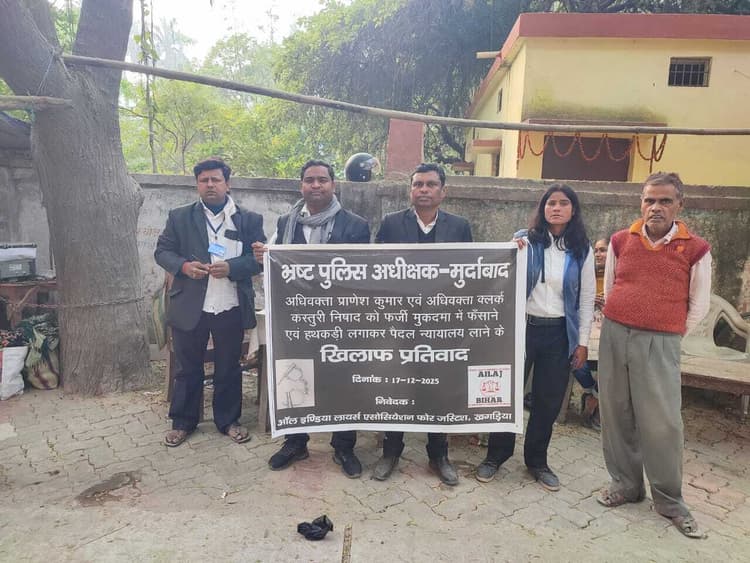खगड़िया. ऑल इंडिया लॉयर्स एसोसिएशन फॉर जस्टिस से जुड़े अधिवक्ताओं ने बुधवार को मुख्य द्वार पर प्रतिवाद किया. बताया जाता है कि पुलिस उप महानिरीक्षक बेगूसराय के न्यायालय परिसर में भ्रमण के क्रम में ऑल इंडिया लॉयर्स एसोसिएशन फॉर जस्टिस से जुड़े अधिवक्ताओं ने प्रतिवाद किया. प्रतिवाद में अधिवक्ता प्राणेश कुमार, अधिवक्ता रंजीत कुमार, अधिवक्ता ललित कुमार, क्लर्क कस्तूरी निषाद शामिल थे. अधिवक्ताओं ने पुलिस अधीक्षक को ऑल इंडिया लॉयर्स एसोसिएशन की ओर से ज्ञापन सौंपा. अधिवक्ता प्राणेश कुमार ने कहा कि गैर जिम्मेदार पुलिस कर्मी को निलंबित किया जाय. चित्रगुप्त नगर थाना पुलिस द्वारा उन्हें गाड़ी से उतार कर हथकड़ी लगाकर पैदल न्यायालय ले जाया गया. जो सर्वोच्च न्यायालय द्वारा दिए निर्देश का उल्लंघन है.