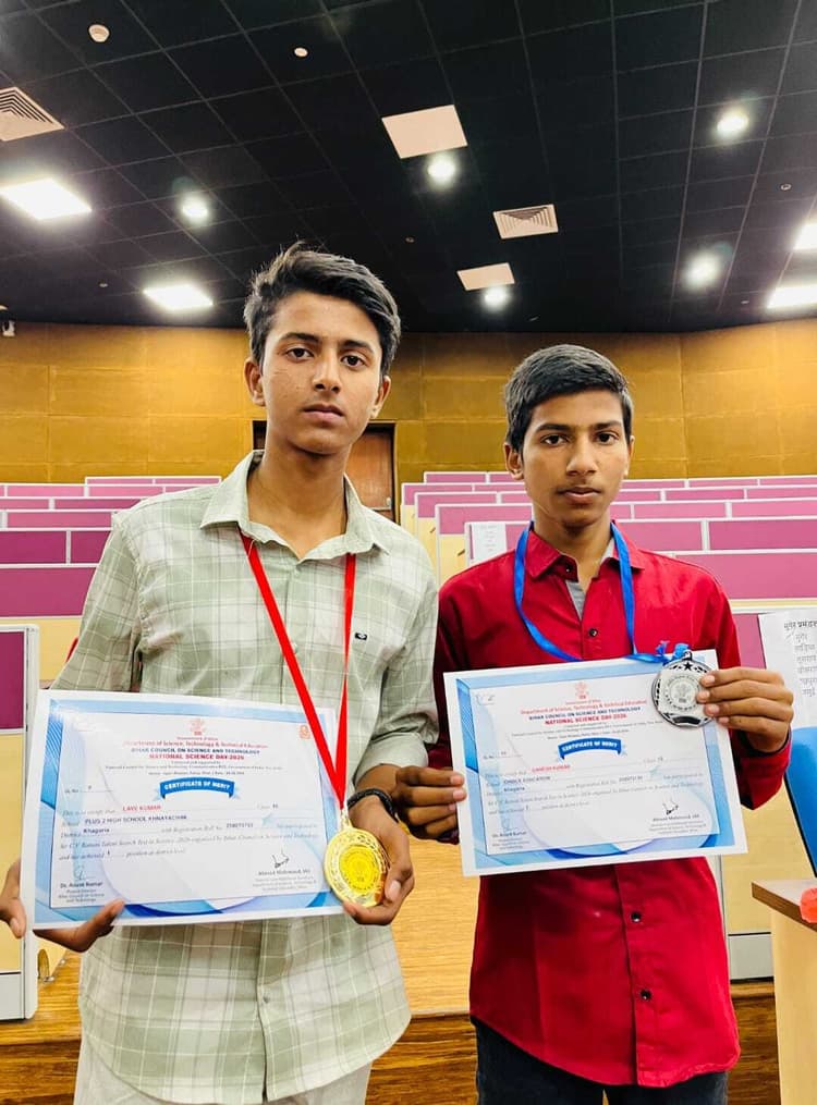 परबत्ता. पटना में आयोजित विज्ञान दिवस के अवसर पर सी वी रमन प्रतियोगिता परीक्षा में उत्कृष्ट प्रदर्शन करने वाले परबत्ता प्रखंड के छात्र लव कुमार को पांच हजार रुपये नगद राशि, प्रमाणपत्र और मेडल से सम्मानित किया गया. वहीं द्वितीय स्थान प्राप्त करने वाले सार्वजनिक रमावती उच्च विद्यालय तेमथा के छात्र गणेश कुमार को तीन हजार रुपये, सर्टिफिकेट और मेडल प्रदान किया गया. राज्य स्तर पर मिला यह सम्मान परबत्ता प्रखंड और पूरे जिले के लिए गर्व का विषय बना. जिला स्तर पर इंजीनियरिंग कॉलेज में भी सम्मान समारोह आयोजित किया गया. यहां तृतीय, चतुर्थ और पंचम स्थान प्राप्त करने वाले अभिजीत आदर्श, प्रिंस कुमार और धर्मराज कुमार को नगद राशि, प्रशस्ति पत्र और मेडल देकर सम्मानित किया गया. कार्यक्रम में उपस्थित शिक्षकों और अभिभावकों ने विद्यार्थियों की सफलता पर प्रसन्नता व्यक्त करते हुए इसे जिले के लिए प्रेरणादायक उपलब्धि बताया.