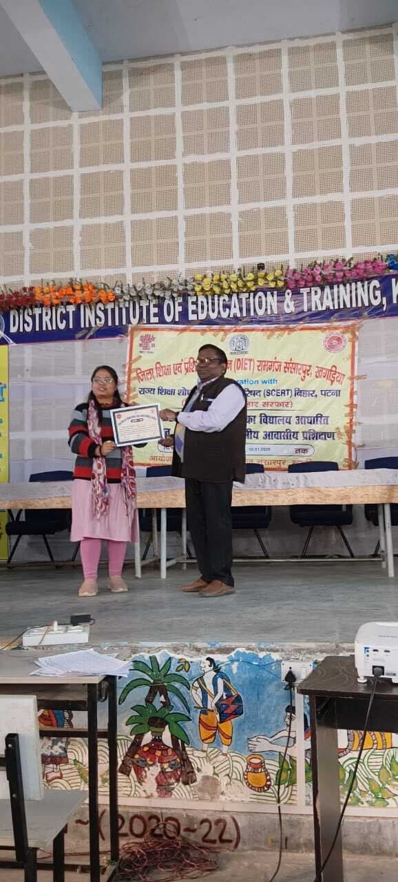 खगड़िया. जिला शिक्षा प्रशिक्षण संस्थान में शनिवार को पांच दिवसीय अध्यापकों का प्रशिक्षण संपन्न हो गया. डायट के प्राचार्य ने अध्यापकों के बीच प्रमाण पत्र वितरण किया. प्राचार्य मनोज कुमार यादव ने बताया कि समग्र शिक्षा व परियोजना निदेशक के निर्देश पर अध्यापकों के कौशल क्षमता विकसित करने के उद्देश्य से प्रशिक्षण दिया गया. जब अध्यापक विद्यालय जायेंगे तो नए तरीके से विद्यालय में शिक्षण कौशल का बच्चों के बीच प्रयोग करेंगे. राज्य साधनसेवी डॉ विक्रांत भास्कर ने बताया कि शिक्षा के अंतर्गत राष्ट्रीय शिक्षा नीति 2020 में निहित उद्देश्य को पूरा करना सभी व्याख्याता और अध्यापकों का कर्तव्य है. ताकि राज्य सरकार के शिक्षा के क्षेत्र में जो कार्य चल रहा है उसे सही तरह से धरातल पर उतारा जा सके. व्याख्याता धर्मनारायण तांती ने कहा कि अध्यापकों को प्रशिक्षण का मॉडल तैयार कर संबंधित विषय को रोचक बनाया जाना चाहिए, ताकि बच्चे पढ़ाई को बोझ नहीं समझे और खेल खेल में भी पढ़ाई का आनंद उठा सके. व्याख्याता पंकज कुमार पंडित ने कहा कि प्रशिक्षण का मुख्य उद्देश्य छात्रों की चिंतन शक्ति को विकसित करेगा. मौके पर प्राचार्य मनोज कुमार यादव, वरीय मो. औरंगजेब, व्याख्याता अर्चना कुमारी, सोनू कुमार, विश्वामोहन राकेश, डॉ विक्रांत भास्कर, पंकज कुमार पंडित, निभा कुमारी, लक्ष्मी कुमारी, प्रशिक्षण प्रभारी वीरेंद्र कुमार, मधु श्री, तेजनारायण कुमारी, मास्टर ट्रैनर अंकित सुमन आदि मौजूद थे.