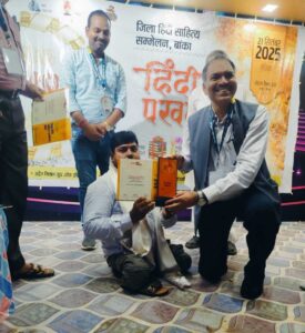 परबत्ता. प्रखंड क्षेत्र के सियादतपुर अगुवानी निवासी प्रधानाध्यापक डॉ. विकास सोलंकी को पूर्णिया के कुलपति प्रो. डॉ. विवेकानंद सिंह ने साहित्य रत्न सम्मान से सम्मानित किया. बताया जाता है कि बांका में आयोजित बिहार हिन्दी साहित्य सम्मेलन के दौरान प्रधानाध्यापक को डॉ. विकास सोलंकी को विश्वविद्यालय के कुलपति प्रो डॉ. विवेकानंद सिंह ने साहित्य रत्न सम्मान से अलंकृत किया. यह सम्मान उन्हें हिन्दी साहित्य में उत्कृष्ट सेवा के लिए दिया गया है. बताते चलें प्रधानाध्यापक डॉ. विकास सोलंकी का हिन्दी गजल संग्रह बंजर में बहार बहुत चर्चित रहा है. बताया जाता है कि उनकी अगली पुस्तक अंगिका गजल संग्रह अंगिका भाषा में बहुत जल्द प्रकाशित होने वाली है.