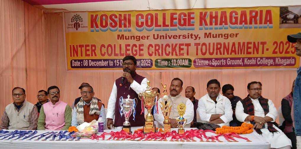 खगड़िया. शहर के कोशी कॉलेज मैदान में आयोजित इंटर कॉलेज क्रिकेट टूर्नामेंट का फाइनल मुकाबला मंगलवार को खेला गया, जिसमें केकेएम कॉलेज जमुई की टीम ने मेजबान कोशी कॉलेज को दो विकेट से पराजित कर खिताब अपने नाम कर लिया. फाइनल मुकाबले में टॉस जीतकर पहले बल्लेबाजी करते हुए कोशी कॉलेज की टीम ने निर्धारित 30 ओवर में 236 रन बनाया. टीम की ओर से बल्लेबाज हर्षित आनंद ने शानदार प्रदर्शन करते हुए नाबाद 121 रन की शतकीय पारी खेली, जबकि प्रिंस कुमार ने 47 रन का योगदान दिया. जवाब में लक्ष्य का पीछा करने उतरी केकेएम कॉलेज जमुई की टीम ने 28 ओवर में आठ विकेट के नुकसान पर लक्ष्य हासिल कर लिया. विजेता टीम की ओर से मोहित कुमार ने 74 रन की अहम पारी खेली. वहीं राज वर्मा ने दबाव में नाबाद 67 रन बनाकर टीम को जीत दिलायी. मौके पर मुख्य अतिथि सदर विधायक बबलू कुमार मंडल ने विजेता टीम के कप्तान सौरभ सिंह चौहान को ट्रॉफी प्रदान किया. प्लेयर ऑफ द मैच का पुरस्कार विजेता टीम के मोहित कुमार को दिया गया. प्लेयर ऑफ द सीरीज का पुरस्कार कोशी कॉलेज के ऑलराउंडर प्रिंस कुमार को प्रदान किया गया. मौके पर जदयू जिला प्रवक्ता आचार्य राकेश पासवान शास्त्री, अति-पिछड़ा प्रकोष्ठ के प्रदेश महासचिव उमेश सिंह पटेल, धर्मेंद्र महतो, किसान व सहकारिता प्रकोष्ठ के प्रदेश महासचिव प्रभाकर चौधरी मंटून, जिला उपाध्यक्ष उदय प्रसाद सिंह, प्रो जयनंदन सिंह, आयोजन समिति के संयोजक डॉ हुमायुं अख्तर, आयोजन सचिव प्रभात कुमार, खेल सचिव मिथिलेश कुमार, क्रीड़ा उपाध्यक्ष लक्ष्मीकांत झा, ललितेश्वर कुमार, धीरज कुमार, डॉ कुमार बलवंत सिंह, डॉ योगेश चन्द्र गुप्ता, आशुतोष कुमार भारती, डॉ छवि, डॉ शितांशु पांडेय, डॉ मनीष कुमार, संतोष रॉय, विनय कुमार पटेल, शशि शेखर श्रीवास्तव, डॉ इंद्रभूषण सिंह कुशवाहा आदि मौजूद थे.