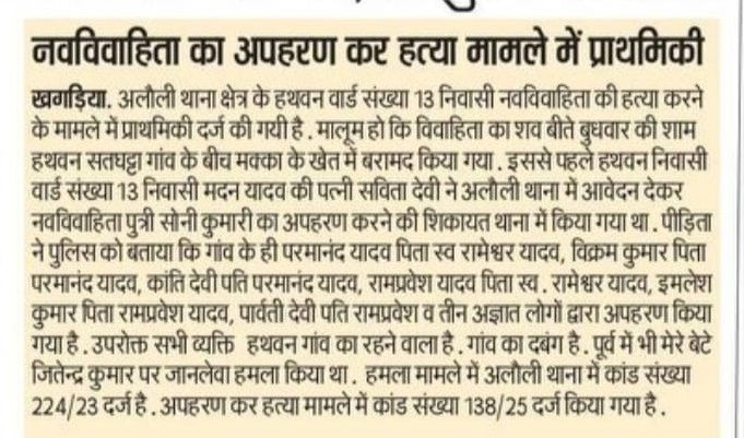 बेटी का शव बहियार में फेंकने के मामले में मां व भाई गिरफ्तार खगड़िया. अलौली थाना क्षेत्र के हथवन की नवविवाहिता शव सतघट्टा गांव के बीच बहियार में पुलिस ने बरामद किया था. नवविवाहिता की मां ने पड़ोसी परमानंद यादव पिता रामेश्वर यादव, विक्रम कुमार पिता परमानंद यादव, क्रांति देवी पति परमानंद यादव, रामप्रवेश यादव पिता स्व. रामेश्वर यादव, इमलेश कुमार पिता रामप्रवेश यादव, पार्वती देवी पति रामप्रवेश यादव तथा तीन अज्ञात के विरूद्ध प्राथमिकी दर्ज करायी गयी थी. मृतका की मां सबिता देवी पति मदन यादव ने पुलिस को आवेदन देकर कही थी कि उपरोक्त लोग दबंग किस्म का व्यक्ति है. उनकी पुत्री सोनी कुमारी शौच करने गयी थी. वे लोग सोनी कुमारी को अपहरण कर लापता कर दिया. अलौली पुलिस द्वारा कांड संख्या 38-25 दर्ज किया गया था. पति से विवाद के बाद नवविवाहिता ने की थी आत्महत्या, पुलिस जांच में खुली पोल अलौली डीएसपी संजय कुमार ने बताया कि बीते 2 अप्रैल को नवविवाहिता के अपहरण मामले में लगभग आधे दर्जन लोगों के विरूद्ध प्राथमिकी दर्ज की गयी थी. अनुसंंधान व तकनिकी साक्ष्य तथा मानवीय सूचना के आधार पर जानकारी मिली की नवविवाहिता सोनी कुमारी का पति से किसी बात को लेकर विवाद हुआ था. आक्रोश में आकर अपने घर में ही 31 मार्च 2025 को फांसी लगाकर जान दे दी थी. इस बात की जानकारी सोनी की मां सबिता देवी को सुबह में मिली थी. अपह्ता सोनी की शव को फंदे से उताकर कमरे में बंद कर दिया. अगले दिन 2 अप्रैल की रात में मृतका के चचेरा भाई हीरालाल पिता लक्ष्मण यादव एवं मृतका की मां सबिता देवी ने साजिश रचकर रात करीब दो बजे धोल बहियार स्थित भूमि यादव के मकई खेत में शव को फेंक दिया. थाना में आवेदन देकर पड़ोसी के विरूद्ध अपहरण कर हत्या की प्राथमिकी दर्ज करायी थी. डीएसपी ने बताया कि 10 दिनों में हत्या की राज से पर्दा उठ गया. मृतका की मां व भाई को गिरफ्तार कर न्यायिक हिरासत में भेज दिया गया.
