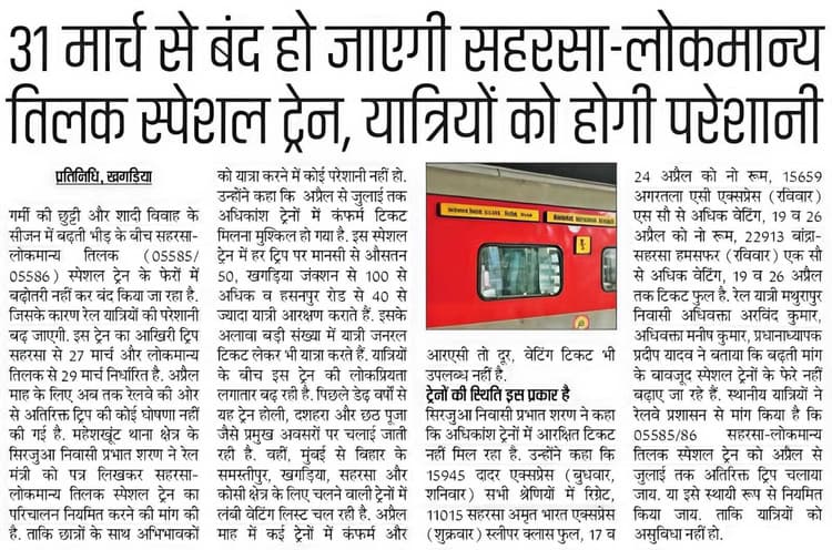 सहरसा-लोकमान्य तिलक स्पेशल ट्रेन 17 अप्रैल से 12 जुलाई तक किया जाएगा परिचालन