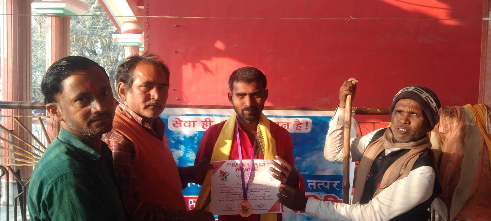 गोगरी. पैरा एथलेटिक्स ओलंपिक में भाग लेने गये गोगरी अनुमंडल के उसरी निवासी प्रीतम कुमार ने गोल्ड मेडल जीतकर खगड़िया जिले का नाम रोशन किया है. बताते चले की पटना में आयोजित राज्य स्तरीय पैरा एथलेटिक्स ओलंपिक में खगड़िया की ओर से चयन कर दिव्यांगजन कल्याण समिति के शिष्य मंडल ने भाग लेने के लिए भेजा था. जिसमें प्रीतम ने 400 मी दौड़ में प्रथम स्थान प्राप्त कर जिले का नाम रोशन किया. इस अवसर पर दिव्यांग जन कल्याण समिति के प्रदेश अध्यक्ष पवन कुमार पासवान, प्रदेश कोषाध्यक्ष दिलीप पासवान, प्रदेश संयुक्त सचिव संदीप पटेल ने अंग वस्त्र देकर सम्मानित करते हुए कहा कि आज जिस प्रकार से 400 मीटर की दौड़ में प्रीतम कुमार ने प्रथम स्थान प्राप्त किया यह गौरव की बात है. अगले महीने चेन्नई में आयोजित राज्य स्तरीय एथलेटिक्स में भाग लेकर हुए वे जिले ही नहीं बिहार का भी नाम रोशन करेंगे. हमारी शुभकामनाएं उनके साथ है.