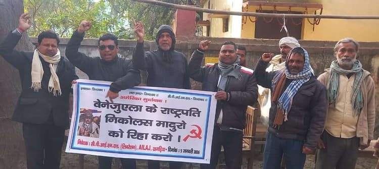 खगड़िया. सीपीआई एमएल लिबरेशन एवं ऑल इंडिया लॉयर्स एसोसिएशन फॉर जस्टिस के संयुक्त तत्वाधान में कार्यकर्ताओं ने सोमवार को न्यायालय के मुख्य गेट के समीप वेनेजुएला के राष्ट्रपति निकोलस मादुरो की रिहाई के लिए प्रदर्शन किया. अमेरिका विरोधी नारे लगाये. मादुरो को रिहा करने की मांग की. कार्यक्रम को संबोधित करते हुए अधिवक्ता प्राणेश कुमार ने कहा कि वेनेजुएला के राष्ट्रपति निकोलस को उसी के देश में घुसकर अमेरिका द्वारा गिरफ्तार करना अंतरराष्ट्रीय कानून का उल्लंघन है. श्री कुमार ने राष्ट्रपति के अगवा की निंदा की. कार्यक्रम को संबोधित करते हुए पार्टी के नेता अभय कुमार वर्मा ने कहा कि राष्ट्रपति निकोलस के गिरफ्तारी से दुनिया युद्ध के मुहाने पर खड़ा है. चंद किशोर वर्मा ने कहा कि पूरे देश के अंदर वामपंथी दल एवं उससे जुड़े जन संगठन वेनेजुएला के राष्ट्रपति निकोलस की गिरफ्तारी के विरोध में प्रदर्शन कर रहे हैं. अधिवक्ता रंजीत कुमार, ललित कुमार ने कहा कि साम्राज्यवादी शक्ति छोटा देश को उपनिवेश बनाना चाहती है.