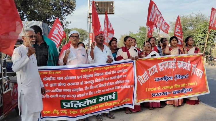 खगड़िया. भारत-अमेरिका व्यापार समझौता, प्रस्तावित बीज बिल 2025, बिजली संशोधन विधेयक तथा मनरेगा से संबंधित प्रावधानों के विरोध में बुधवार को एटक, खेत मजदूर यूनियन, किसान सभा एवं एफ-टू-न्यू के संयुक्त तत्वावधान में बापू नगर स्थित योगीन्द्र भवन से प्रतिरोध मार्च निकाला गया, जो शहर के विभिन्न मार्गों से होते हुए बलुआही एनएच-31 तक पहुंचा. प्रतिरोध मार्च का नेतृत्व बिहार राज्य खेत मजदूर यूनियन के उप महासचिव पुनीत मुखिया, बिहार राज्य किसान सभा के राज्य उपाध्यक्ष प्रभा शंकर सिंह, एटक के राज्य कार्यकारिणी सदस्य चंद्रजीत कुमार, जिला एटक की महासचिव निर्मला कुमारी, जिला अध्यक्ष रमेश चंद्र चौधरी, वंदना कुमारी, पूजा कुमारी एवं एफ-टू-न्यू के सुनील कुमार ने भाग लिया. मार्च में आंगनबाड़ी कर्मचारी यूनियन की सेविकाओं सहित विभिन्न संगठनों के किसान-मजदूरों ने बड़ी संख्या में भाग लिया. बलुआही एनएच-31 पर प्रभाशंकर सिंह की अध्यक्षता में सभा आयोजित की गयी. सभा को संबोधित करते हुए बिहार राज्य खेत मजदूर यूनियन के उप महासचिव पुनीत मुखिया ने कहा कि मजदूरों ने लंबे संघर्ष के बाद जो अधिकार हासिल किए थे. उन्हें समाप्त कर मजदूर विरोधी चार श्रम संहिताएं लागू की जा रही है. जो पूंजीपतियों के पक्ष में है. उन्होंने भारत-अमेरिका व्यापार समझौते को किसानों पर हमला बताते हुए इसे वापस लेने की मांग की. उन्होंने कहा कि मनरेगा को कमजोर करने वाले प्रावधानों को रद्द किया जाय. प्रस्तावित बीज बिल और बिजली संशोधन अधिनियम को वापस लिया जाय. एटक की जिला महासचिव निर्मला कुमारी ने कहा कि आंगनबाड़ी सेविका एवं सहायिकाओं को सरकारी कर्मचारी का दर्जा नहीं दिया गया है. वे न्यूनतम मजदूरी से कम पर काम करने को मजबूर हैं. मौके पर रमेश चंद्र चौधरी, चंद्रजीत कुमार, सुनील कुमार, मीनाक्षी कुमारी, वंदना कुमारी, रीता कुमारी, विभाष चंद्र बोस, चंद्रकिशोर यादव आदि मौजूद थे.