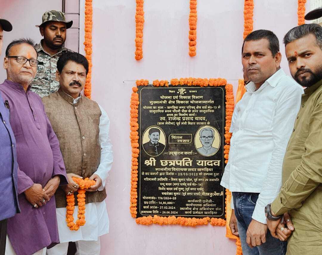 खगड़िया. नगर परिषद क्षेत्र के वार्ड संख्या 13 में चांदनी चौक के समीप सामुदायिक भवन का उद्घाटन सदर विधायक छत्रपति यादव ने किया. योजना एवं विकास विभाग मुख्यमंत्री क्षेत्र विकास योजनांतर्गत 14 लाख 80 हजार रुपये की लागत से निर्माण किया गया. कार्यकारी एजेंसी कार्यपालक अभियंता, स्थानीय क्षेत्र अभियंत्रण संगठन, कार्य प्रमंडल द्वारा किया गया. विधायक छत्रपति यादव ने कहा कि लंबे समय से स्थानीय लोगों की मांग थी. सामुदायिक भवन निर्माण से अब स्थानीय लोगों में खुशी का माहौल है. कहा कि विकास का कार्य निरंतर जारी रहेगा, ताकि आम जनता की समस्याओं का समय समाधान हो सके. मौके पर डॉ अरविन्द वर्मा, वरिष्ठ पत्रकार चंद्रशेखरम, नगर परिषद के कनीय अभियंता रौशन कुमार, पूर्व उपसभापति विनय पटेल, वार्ड संख्या 14 के वार्ड पार्षद पप्पू यादव, पूर्व नगर परिषद विनोद यादव उर्फ़ गुग्गु यादव, वार्ड पार्षद प्रतिनिधि अक्षय कुमार सुरी, गौतम कुमार उर्फ भैयाजी, शंकर यादव व गौतम यादव आदि लोग मौजूद थे.
