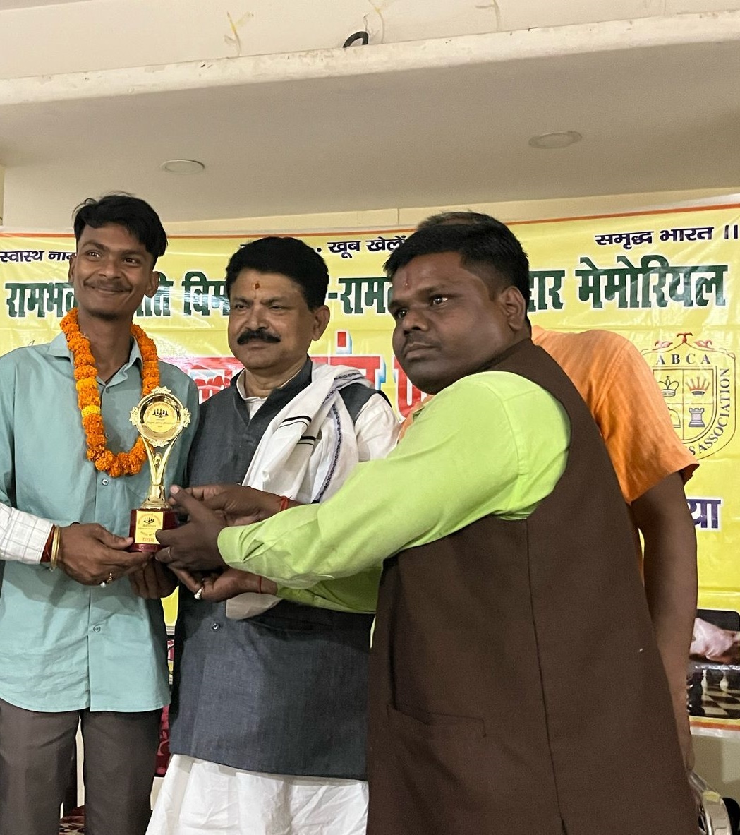 खगड़िया. नशा मुक्त भारत शतरंज अकादमी के तत्वावधान में रामभक्त दंपती विमला देवी रामलखन पौद्दार मेमोरियल नि:शुल्क शतरंज प्रतियोगिता विवाह भवन में आयोजित किया गया. पुरस्कार वितरण समारोह के मुख्य अतिथि सदर विधायक छत्रपति यादव, विशिष्ट अतिथि बरौनी के रेल डीएसपी गौरव पांडेय, विश्व हिन्दू परिषद के पूर्व जिलाध्यक्ष नितिन कुमार चुन्नु, ग्राम स्वराज संघ बलहा के अध्यक्ष संतोष कुमार आदि मौजूद थे. प्रतियोगिता में ओपन वर्ग में प्रथम स्थान शुभम कुमार, द्वितीय स्थान पूर्व जिला चैम्पियन हर्षवर्धन राज, तृतीय लखीसराय के शिवप्रिय भारद्वाज और चतुर्थ पुरस्कार रुद्रवीर सिंह ने प्राप्त किया. बालिका में प्रथम स्थान बेगूसराय की बैश्नवी वत्स, द्वितीय खगड़िया अंडर 19 की पूर्व बिहार चैम्पियन तन्नु कुमारी, अंडर 17 में खगड़िया के मानव कुमार, द्वितीय विनित विनायक, तृतीय स्थान भागलपुर के शिवम कुमार, अंडर 13 के प्रथम स्थान पर मधेपुरा के रसिक शमिम, द्वितीय स्थान मधेपुरा के ही अक्षत राज मोनु, तृतीय स्थान खगड़िया के रेटेड शतरंज खिलाड़ी अंकित कुमार तिवारी, अंडर 9 में प्रथम स्थान पर बेगूसराय के विष्णु वैभव, द्वितीय और तृतीय स्थान पर अन्य जिले के खिलाड़ी क्रमशः पियुष कुमार और हर्षित आंनद प्राप्त किया. प्रतियोगिता की सबसे छोटी खिलाड़ी बरौनी की अद्वेता पांडेय को विशिष्ट पुरस्कार ट्राफी देकर सम्मानित किया गया. इसकेे अलावे सभी 70 प्रतिभागी को मेडल देकर सम्मानित किया गया. सभी सफल प्रतिभागी को विधायक व संघ द्वारा सम्मानित किया गया. खिलाड़ियों के साथ 11 जिले से आए 25 अभिभावकों को नशा मुक्त भारत शतरंज अकादमी द्वारा मोमेंटो देकर सम्मानित किया गया. मौके पर कोषाध्यक्ष अम्बुज कुमार पौद्दार, विवेक भगत, सांभवी पांडेय, युगल किशोर आदि मौजूद थे.
