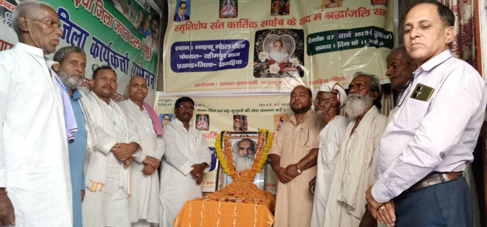 खगड़िया. सदर प्रखंड के नन्हकू मंडल टोला संत कार्तिक साहेब की तीसरी पुण्यतिथि मनायी गयी. कार्यक्रम की अध्यक्षता जदयू जिलाध्यक्ष बबलू कुमार मंडल ने की. सभा की शुरुआत में साधु-संतों ने संत कार्तिक साहेब के तेल चित्र पर माल्यार्पण और पुष्पांजलि अर्पित श्रद्धांजलि दी. जिलाध्यक्ष ने कहा कि संत कार्तिक साहेब का जीवन समाज को सुधारने और सामाजिक कुरीतियों से लड़ने का एक आदर्श प्रस्तुत करता है. बाल विवाह, दहेज प्रथा, नशा, हिंसा और मृत्यु भोज जैसी कुरीतियों के खिलाफ उनका संदेश आज भी प्रासंगिक है. उन्होंने आचार्य राकेश पासवान शास्त्री द्वारा पिता की सेवा में दिखाए गए पितृ भक्ति को समाज के लिए प्रेरणास्रोत बताया. मौके पर जदयू नेता डॉ विद्यानंद दास, जदयू श्रम व तकनीकी प्रकोष्ठ के प्रदेश महासचिव मनोज कुमार सिंह, किसान व सहकारिता प्रकोष्ठ के जिला अध्यक्ष ललित चौधरी, प्राचार्य डॉ. अमित कुमार, प्रो विनय कुमार पासवान, रामाकांत पासवान, हीरालाल साहेब, बौधू साहेब आदि मौजूद थे.